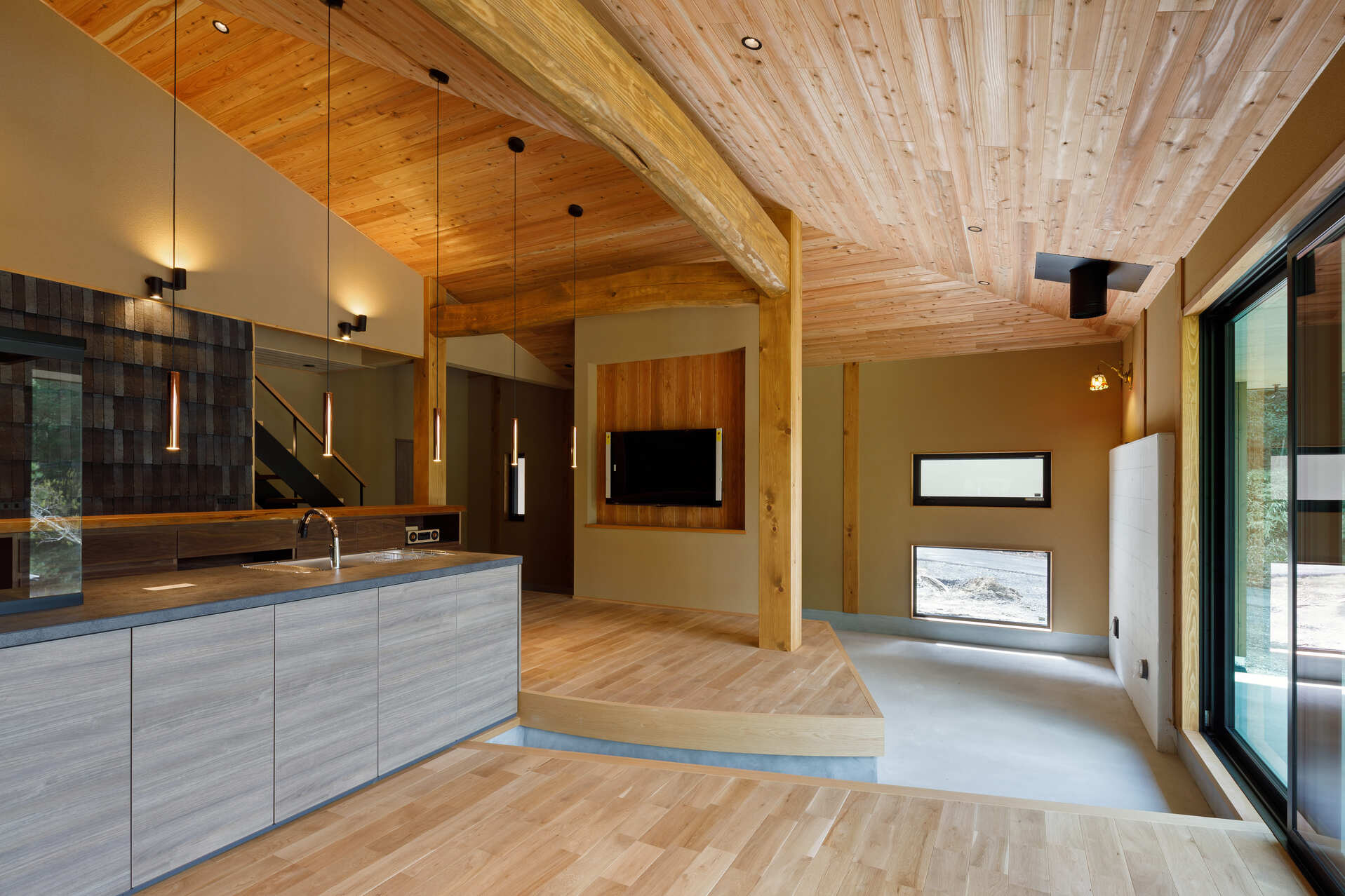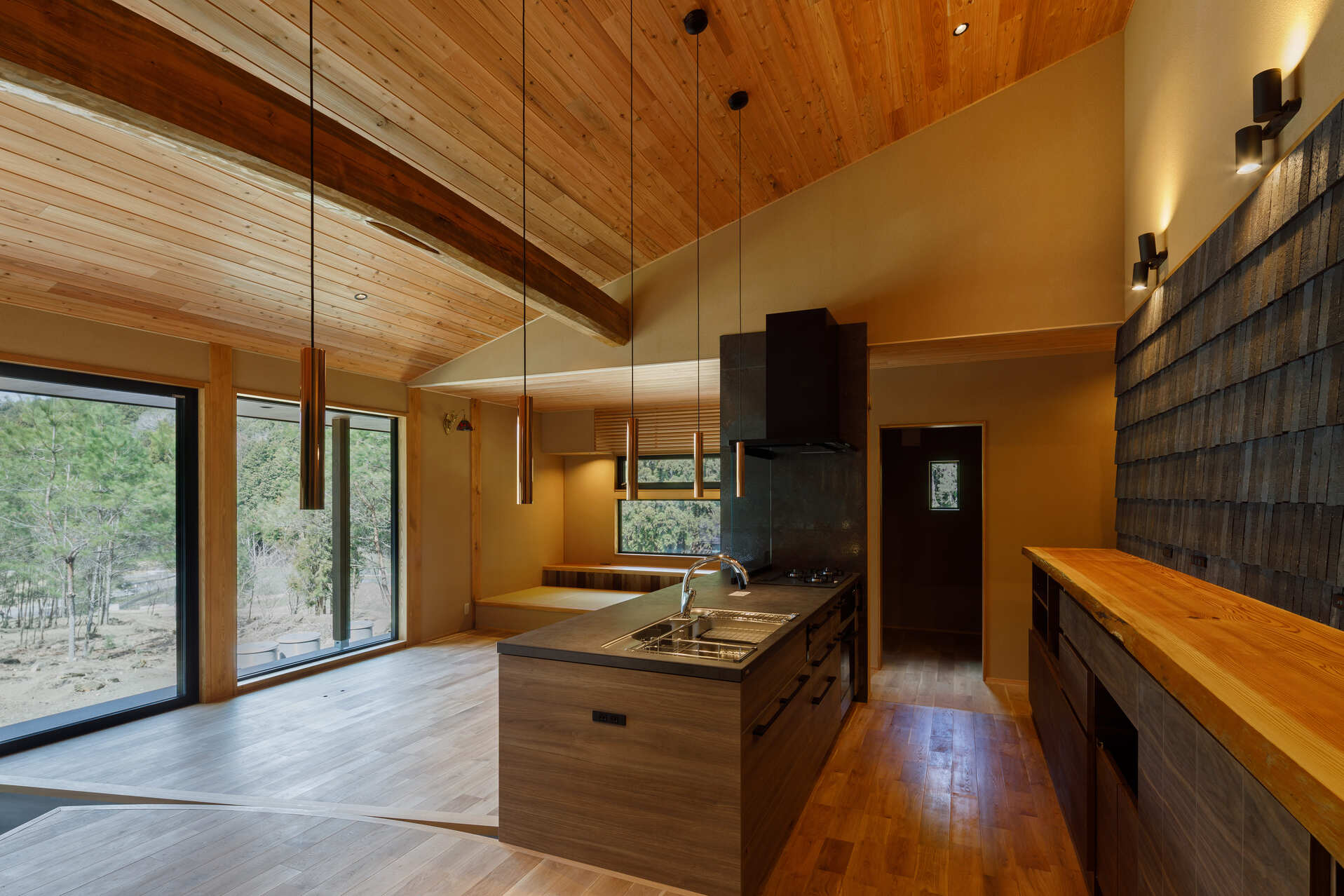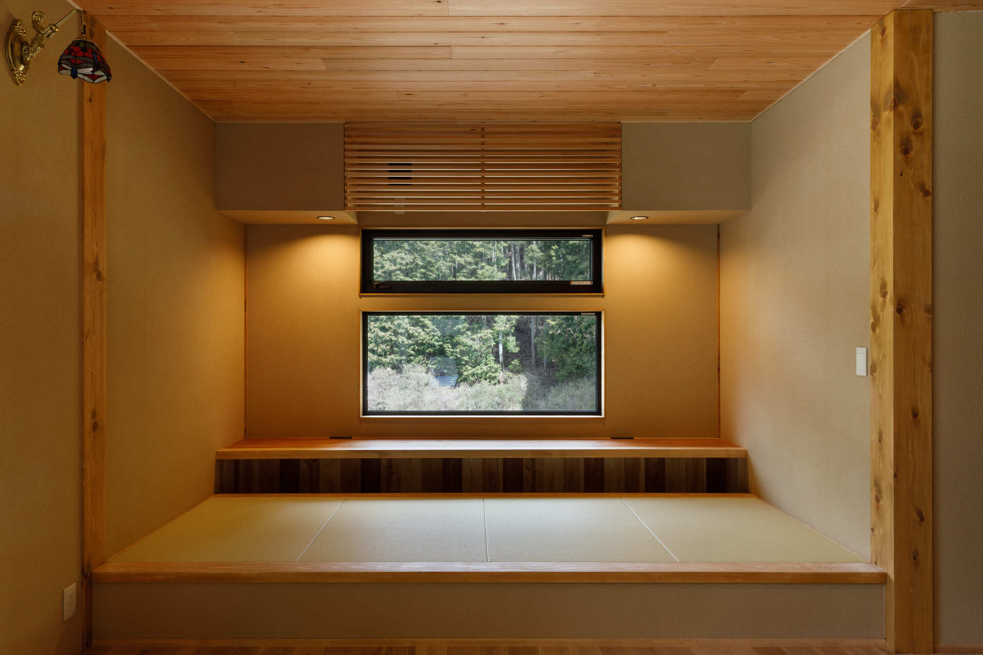 目の前に森があり木々を見ながらコーヒーを飲んだり作業をしたり、そのまま畳にゴロンと横になれる空間になっています。