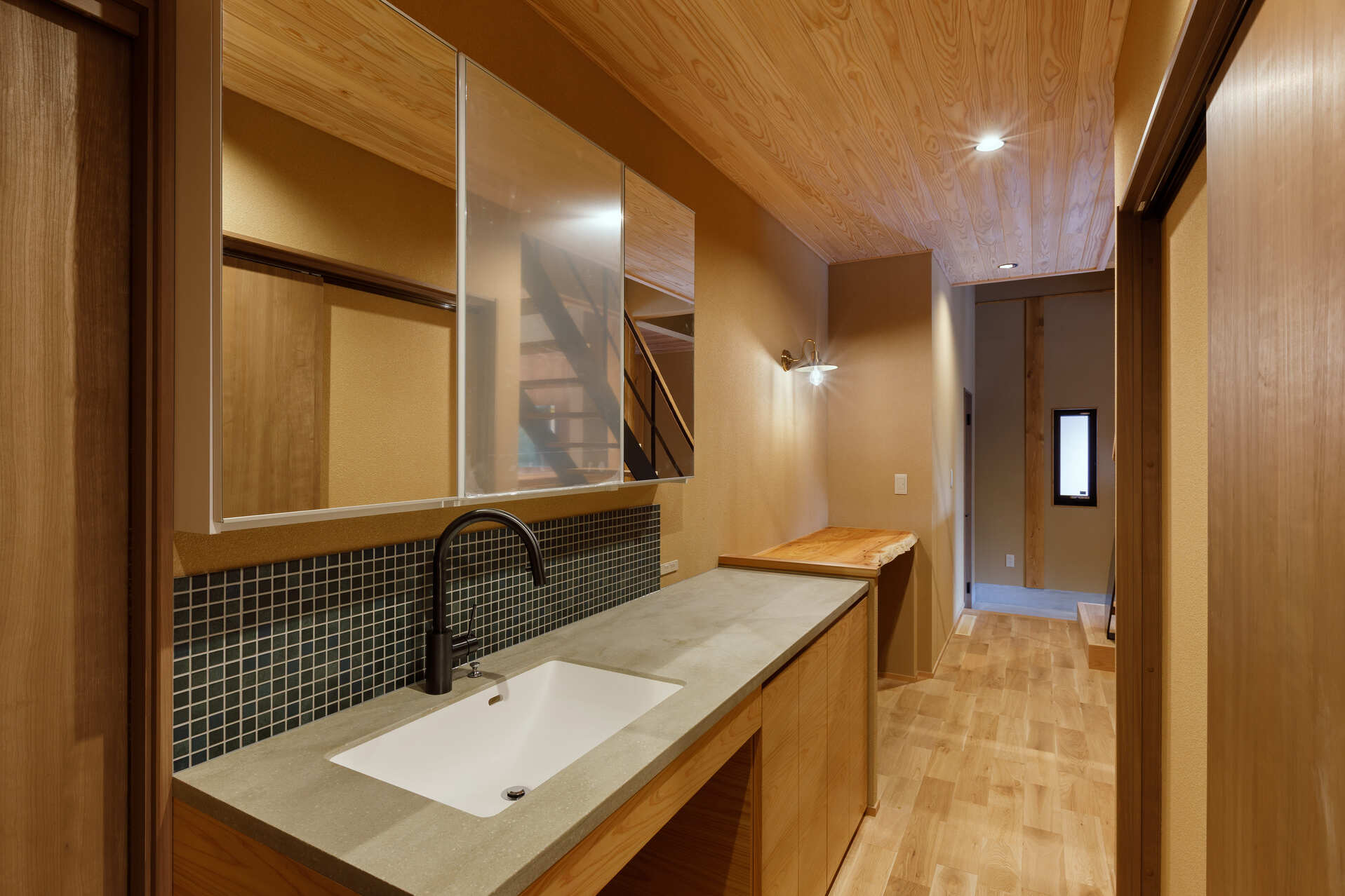 洗面化粧台はタカラスタンダード製の三面鏡に、アイカ工業のスタイリッシュカウンターを採用し、下台はオリジナル家具として作成しています。