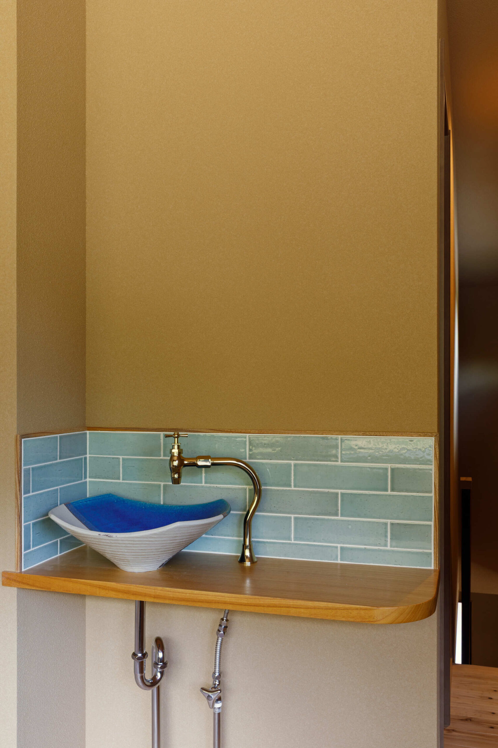 ホールの脇に手洗いコーナー、こちらの陶器と水栓はお施主様選定の支給品を施工し、青系のタイルで爽やかに仕上がっています。