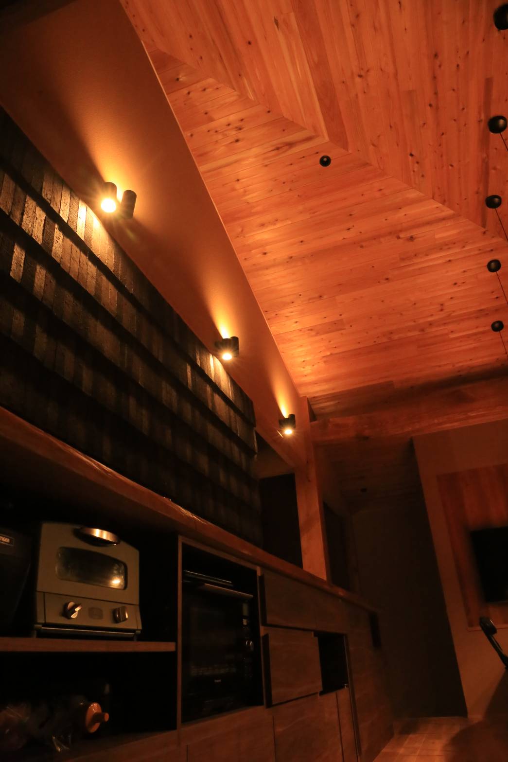 キッチン背面には三角の形をしたタイルを貼り、上部のブラケットライトの光がタイルの凸凹に当たり、陰影を楽しむ計画