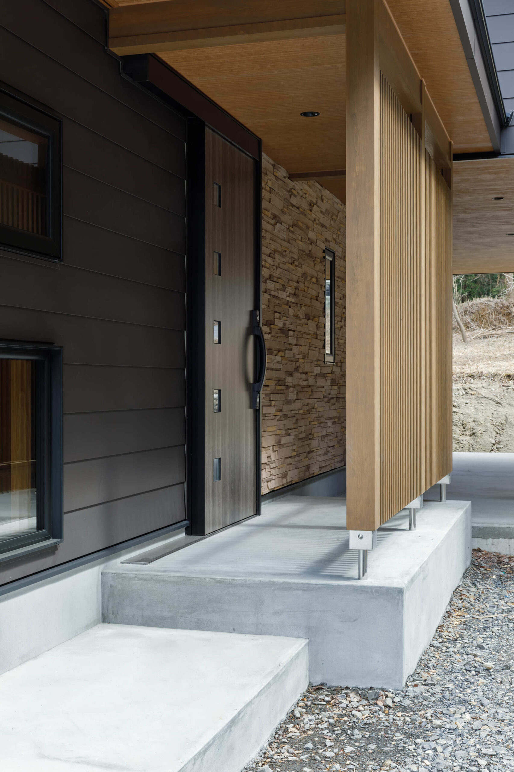 メインの玄関の前には桧の格子長さも約3mほどあり、目線の遮りと外部からのアクセントになっております。