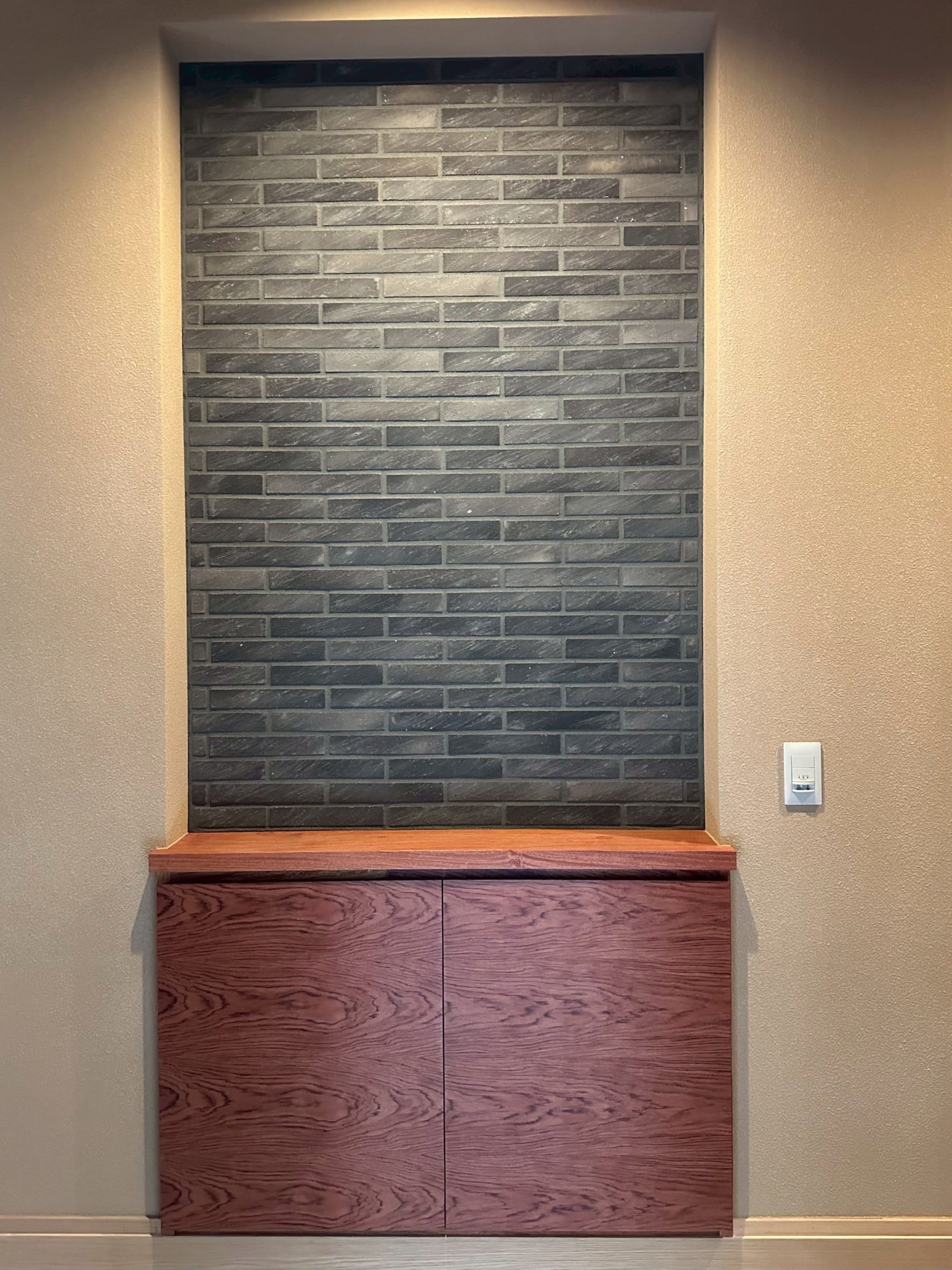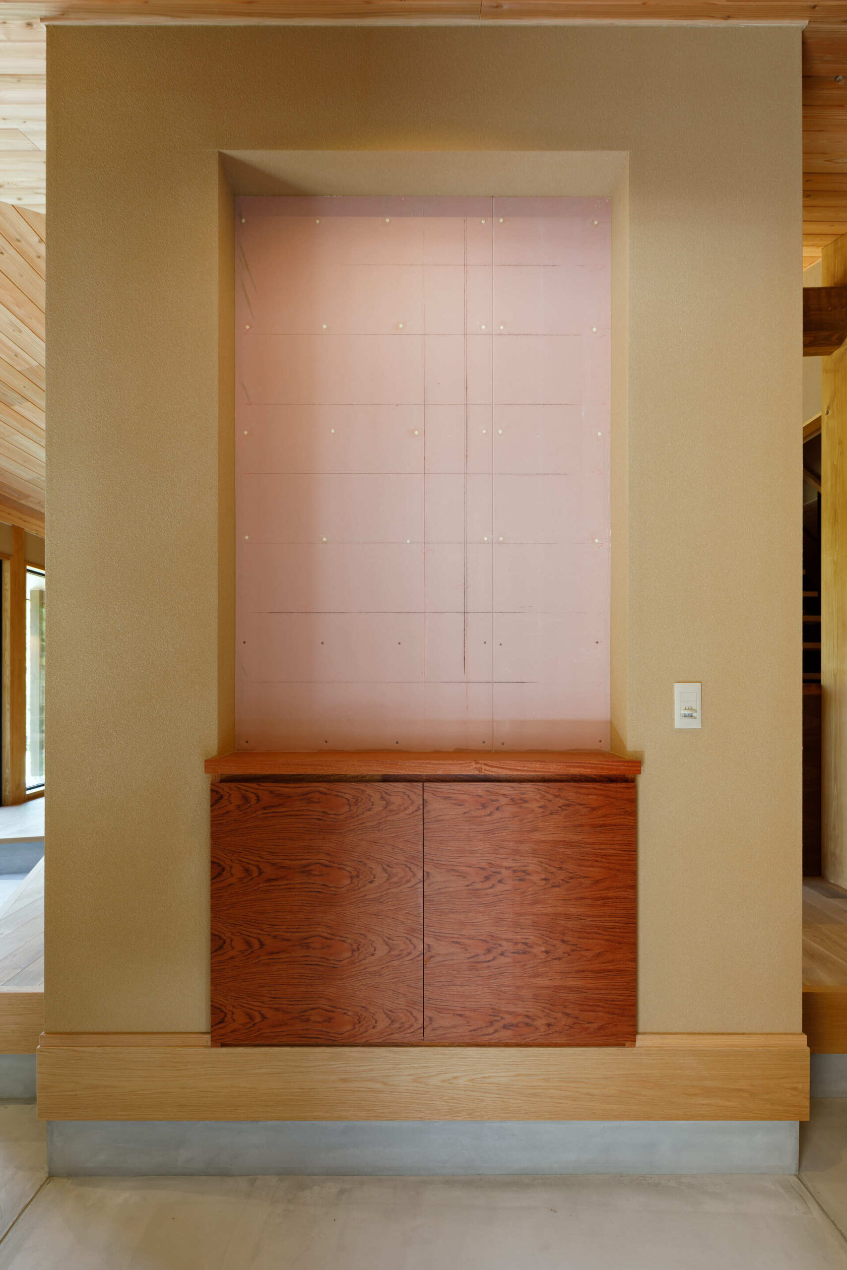撮影時はタイルが納期待ちでしたので未施工ですが・・、本社にて選定いただいた無垢板【カリン】にて作成した下足箱と建具には、ブビンガの突板を使用し作製した建具がお出迎え!