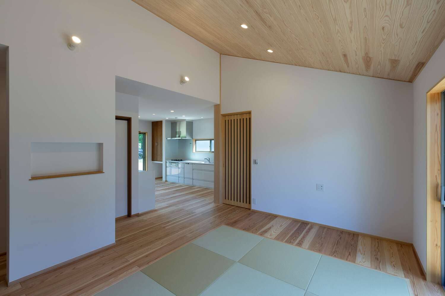 内観は、勾配天井、リビング畳敷き、スタディースペースは、堀こたつと