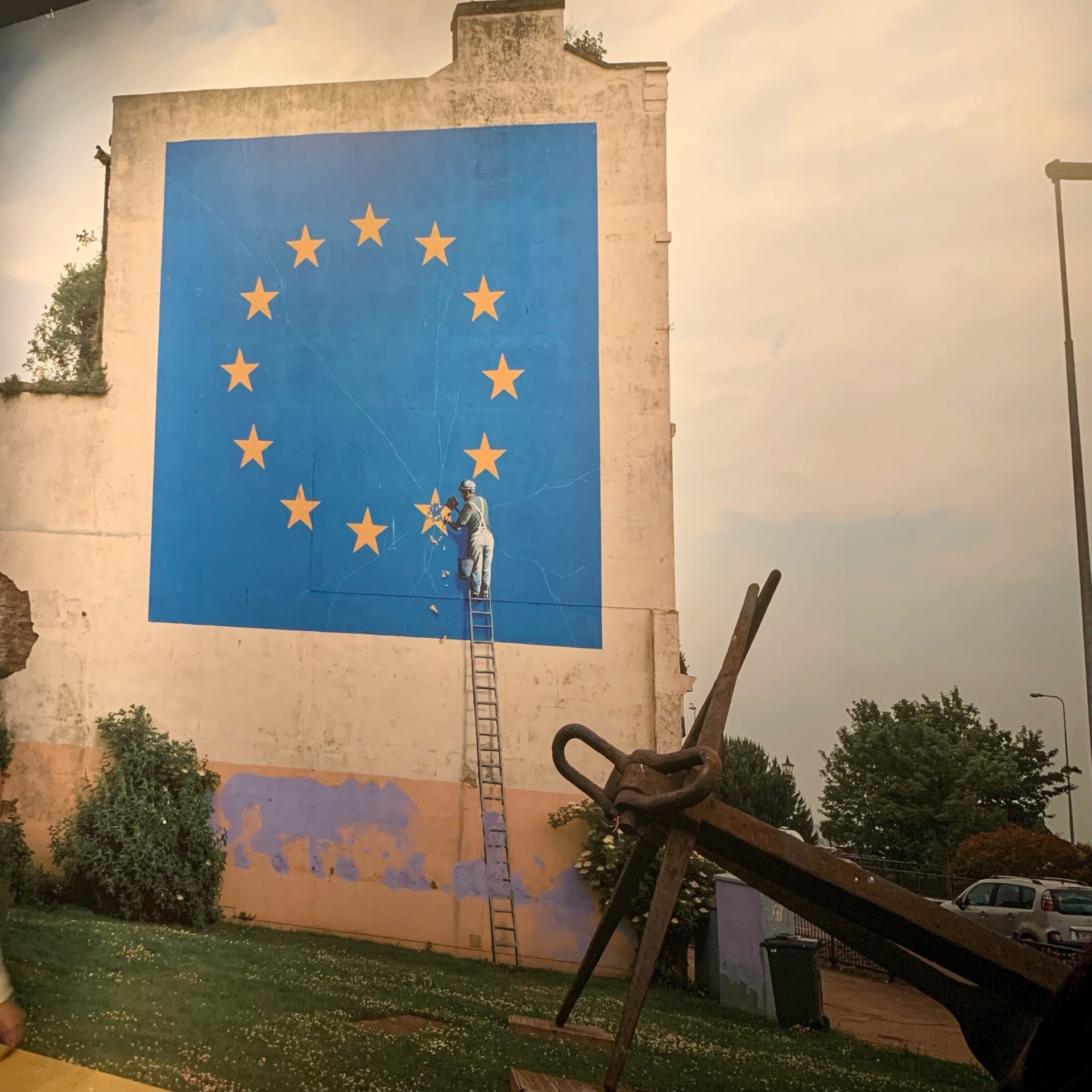 ヨーロッパ連合の旗から作業員が金色の星の1つを削り取る様子が描かれていて、