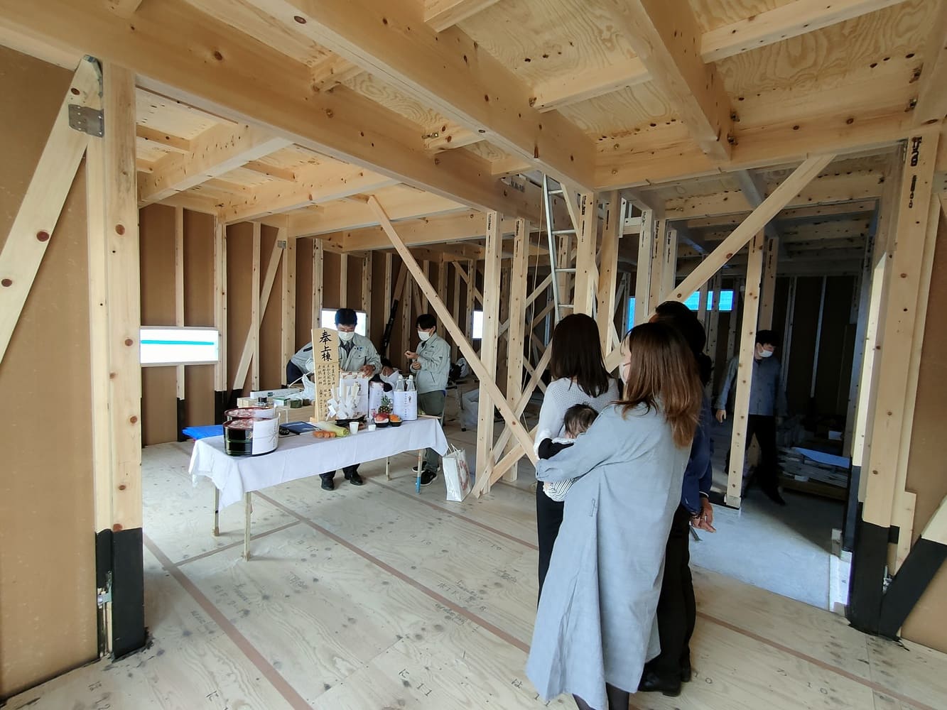 上棟式当日は、大工さん・職人さんの手によって、お家の形がどんどんできていくことに感動されていました。