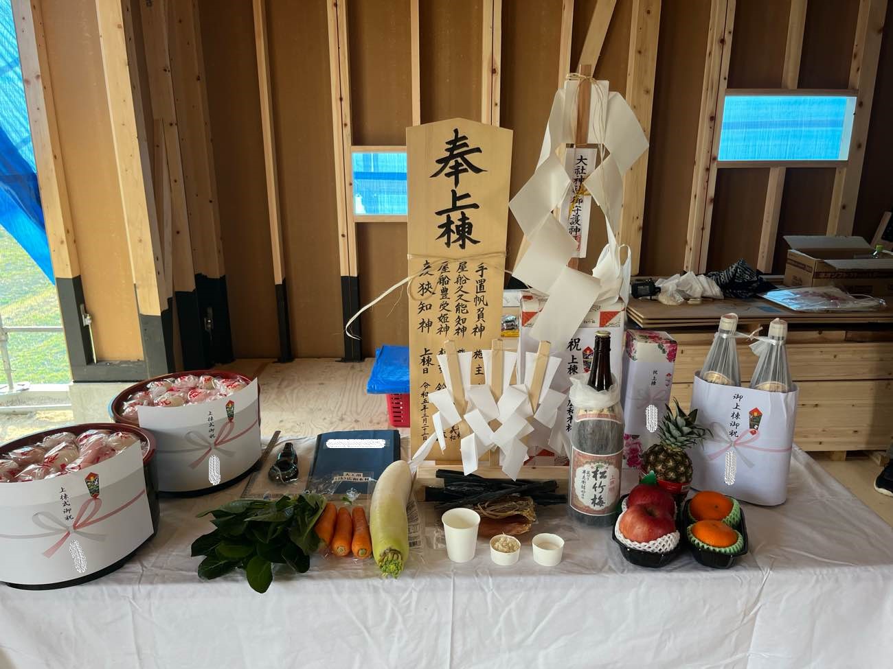 上棟式では、服部棟梁のもと工事の安全祈願と四方のお清めをさせて頂きました。