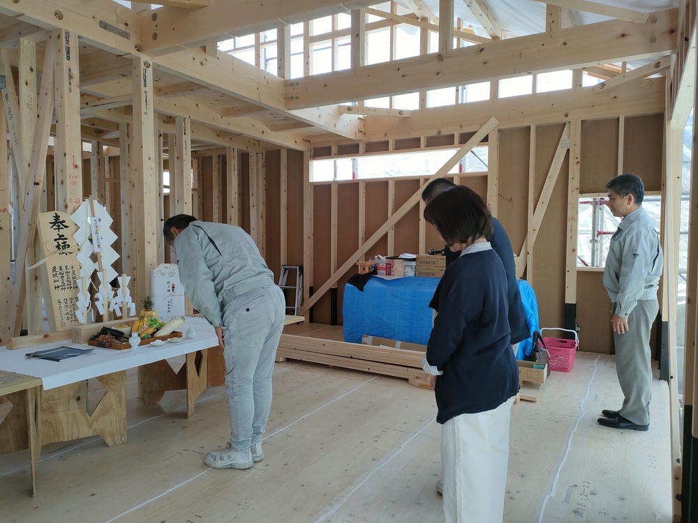 棟梁の鈴木大工さんに工事の安全を祈願して頂き、無事上棟式を執り行うことができました。
