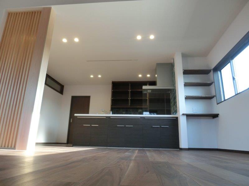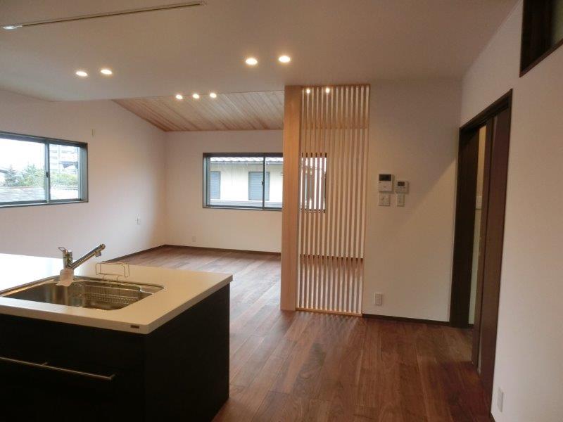 明るいキッチンとデザインタイルが映える素敵なリビングになりました。