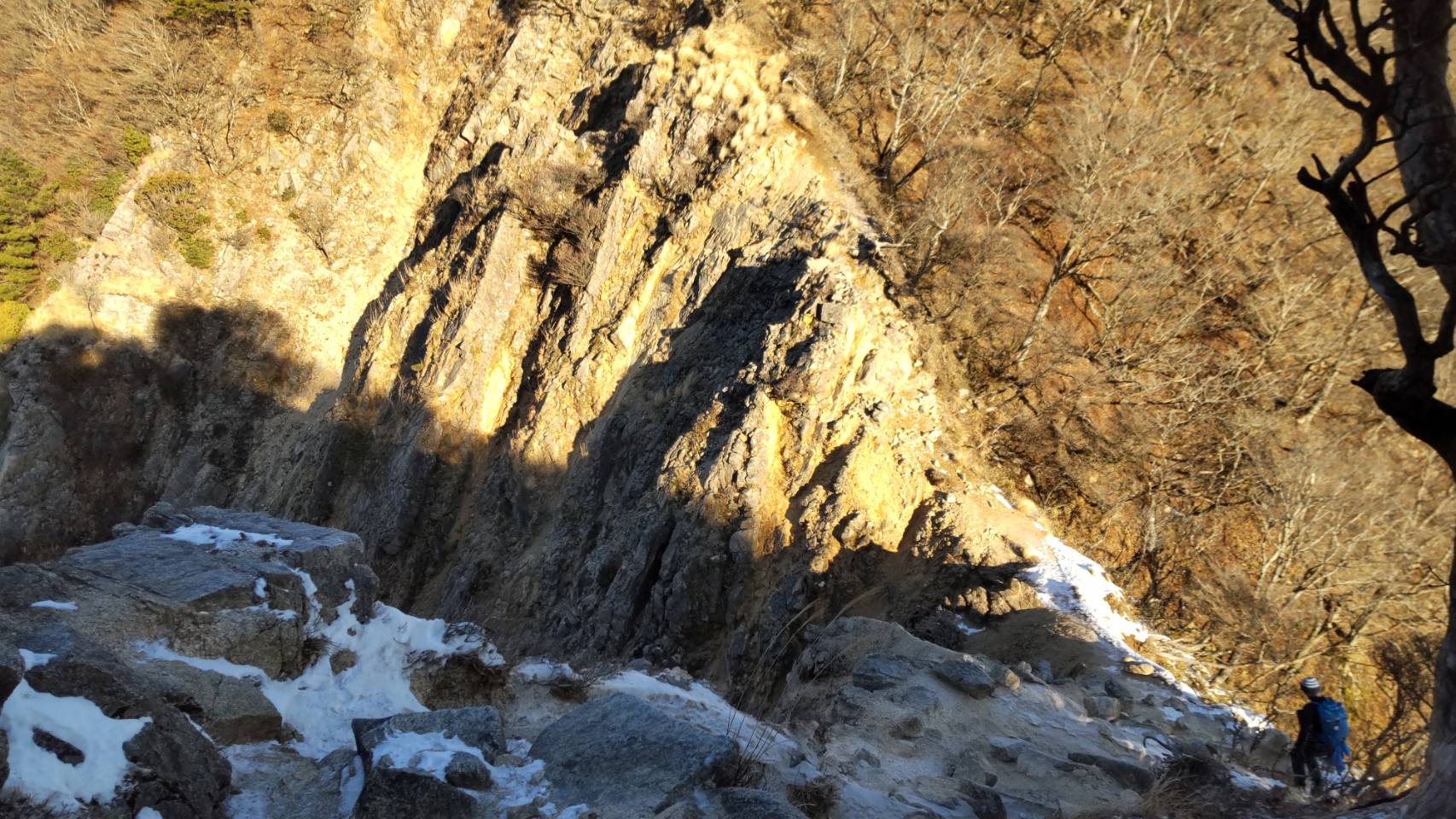 先程の大ガレが見えます。あの辺りは、お釈迦様の喉から首のあたりですね。