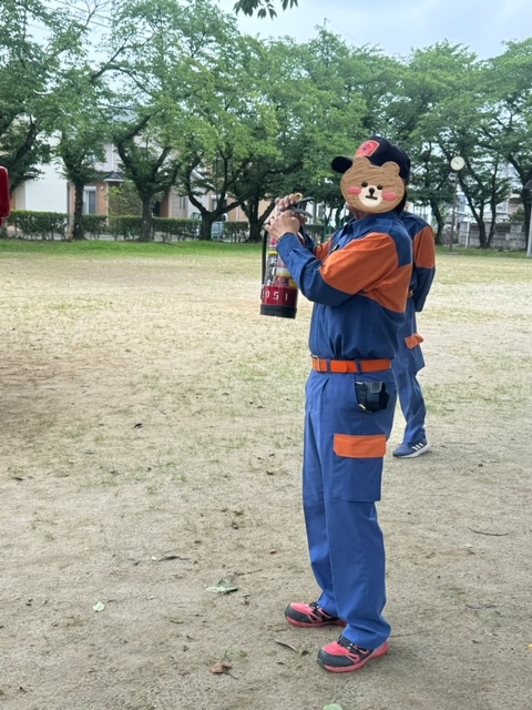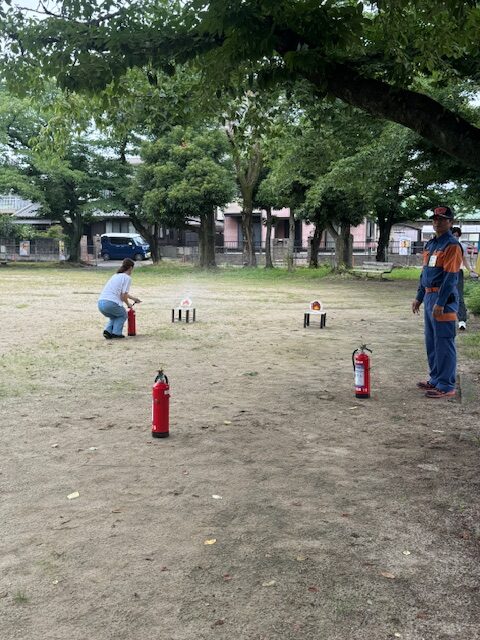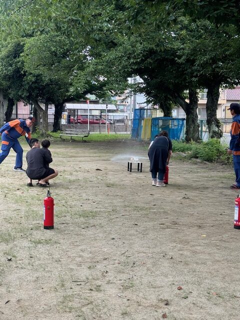 まずは火災を想定して、実際に消火器を使ってみる体験から…