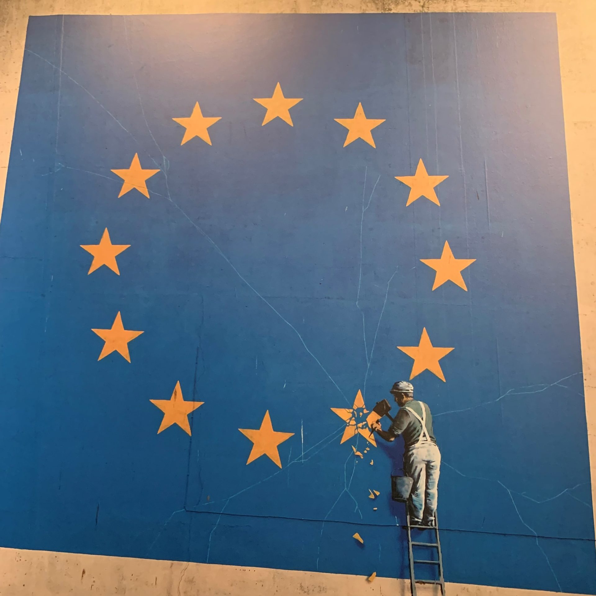 ヨーロッパ連合の旗から作業員が金色の星の1つを削り取る様子が描かれていて、