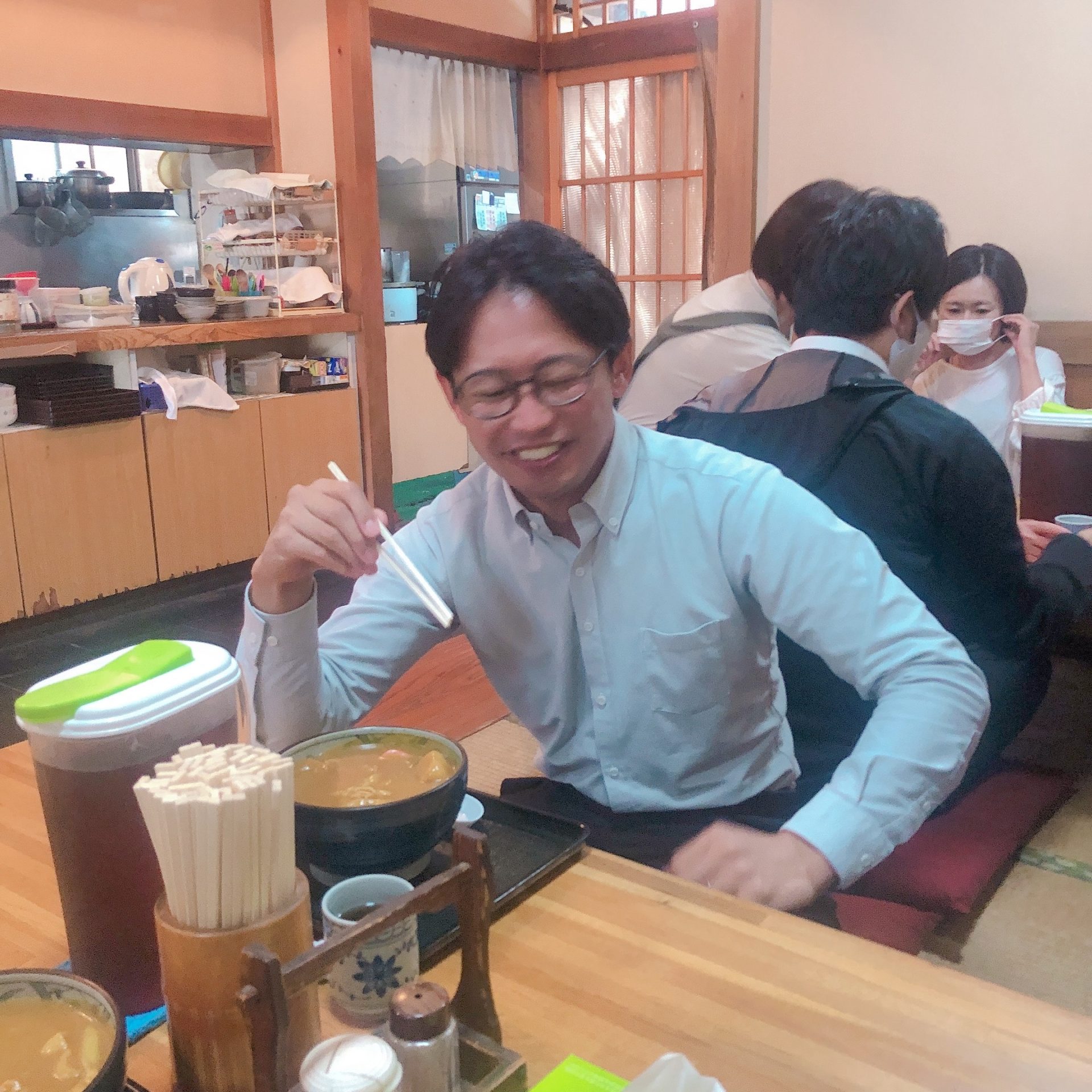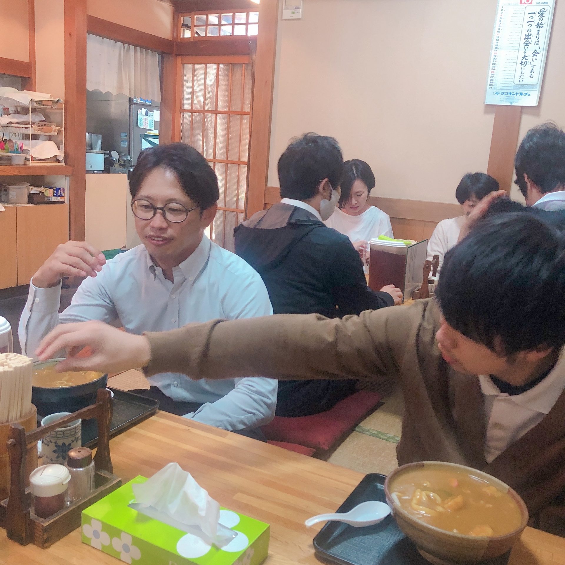 田口さん、佐橋さん、私は並のカレーうどん、福重さんは中盛のカレーうどんを注文