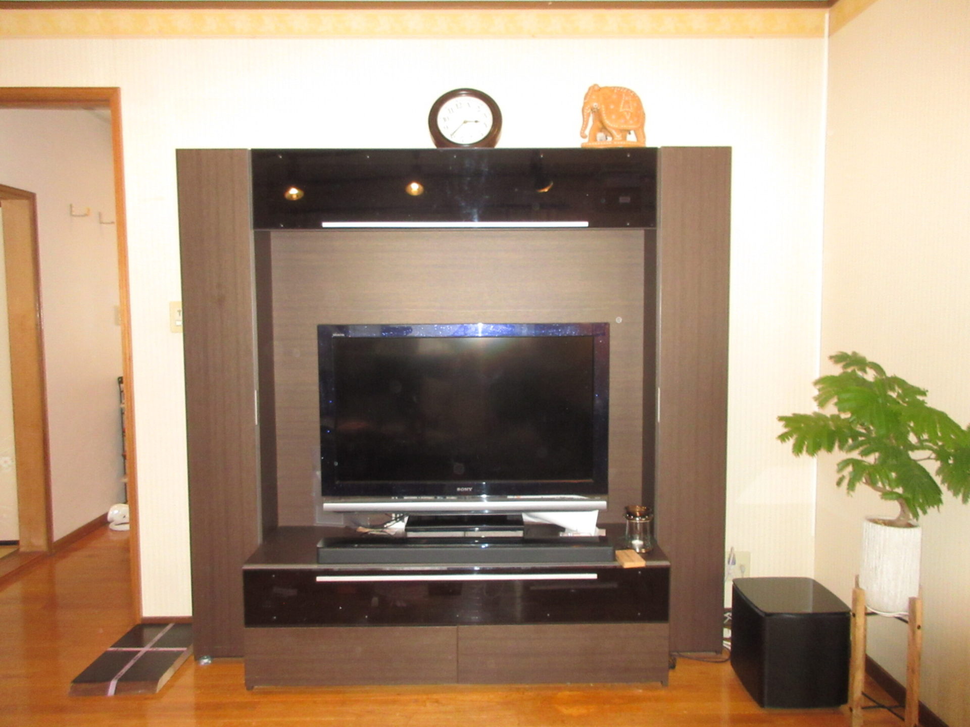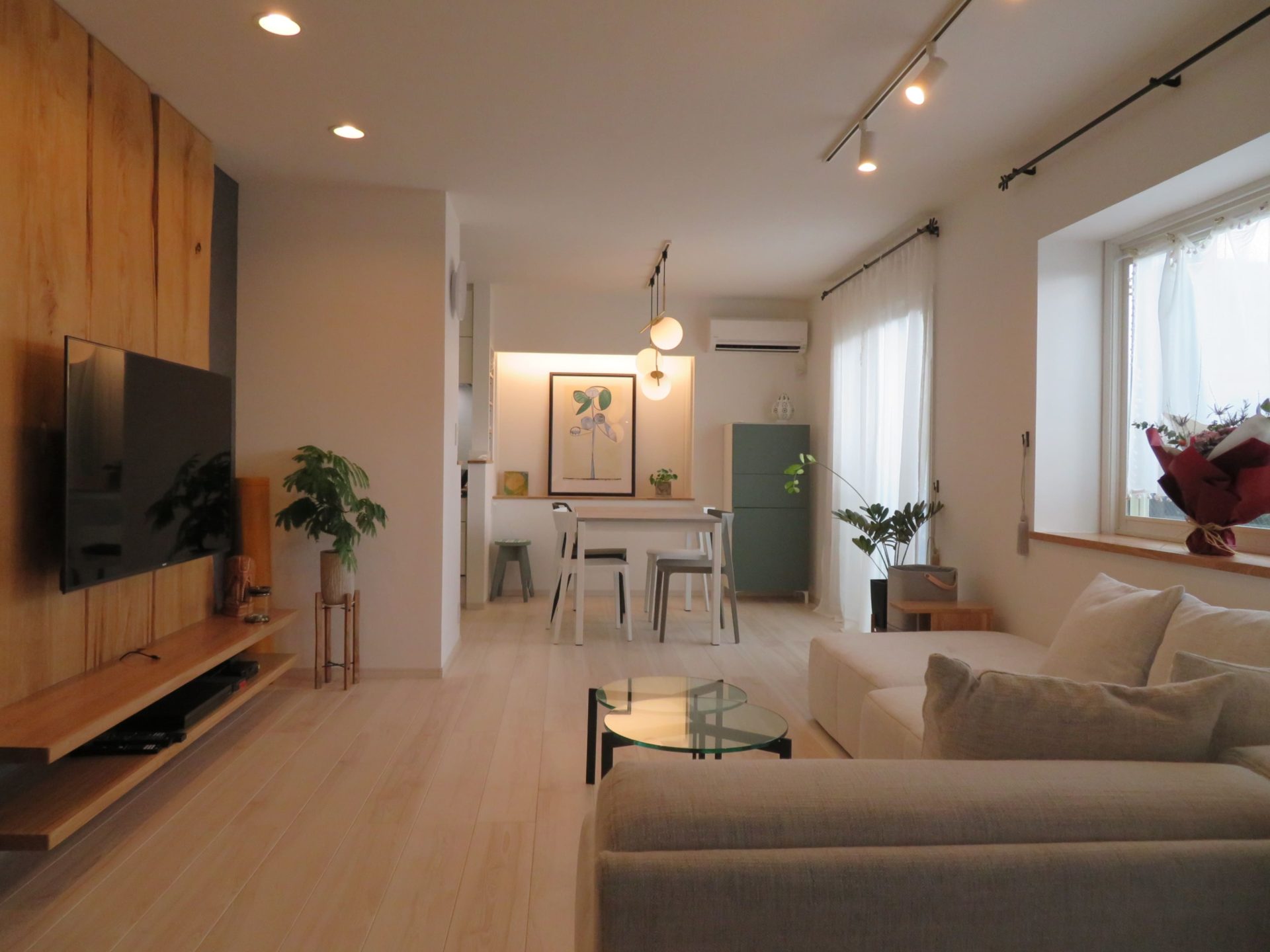 TVボード横の建具は既存の扉を塗装して再利用しました♬