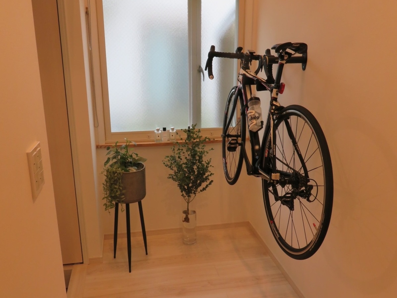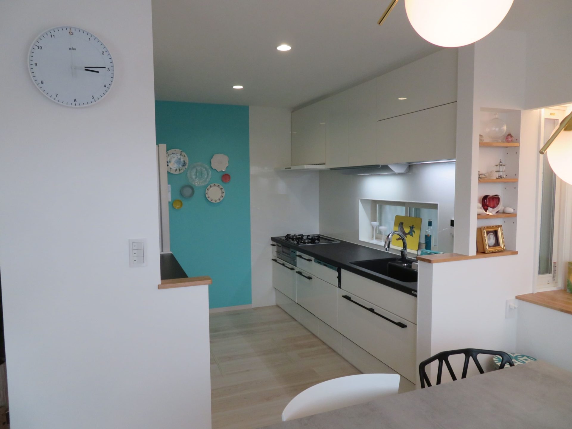 白を基調としたお部屋にアクセントクロスが映えますね😊