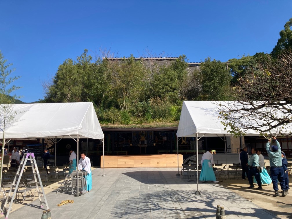 重要文化財≪御本殿≫は、124年ぶりの令和の大改修に伴う、特別な≪仮殿≫にて参拝。