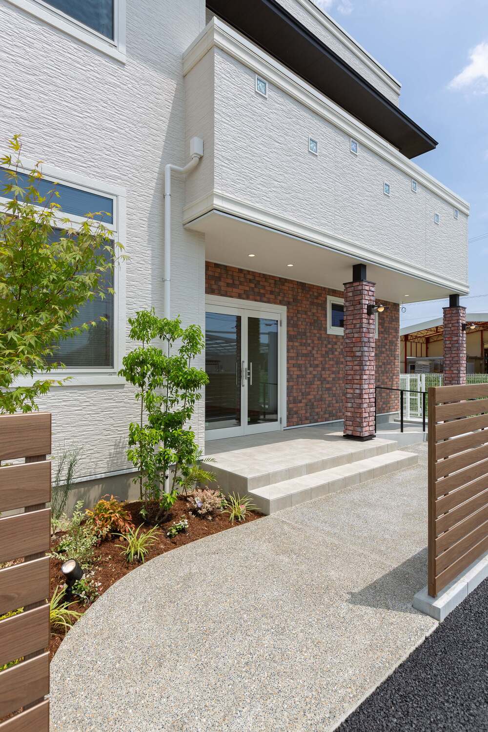 外観はホワイト色をベースに、レンガ風タイルや4色のガラスブロックなどでアクセントを出しています。