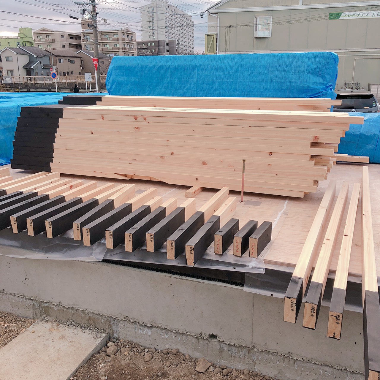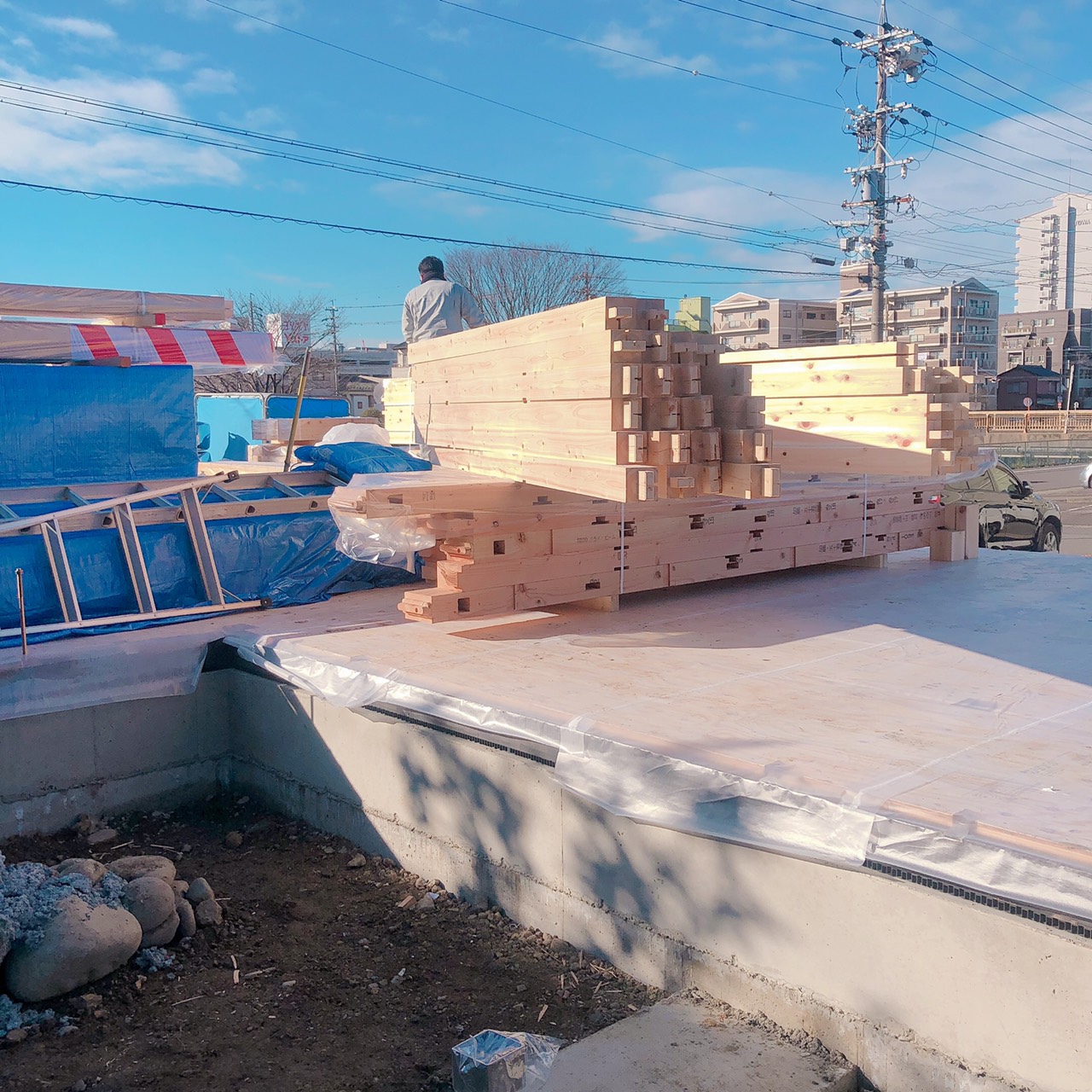 車幅5台分ほどある通し柱を伊藤さんと運ぶのは、とても大変😓