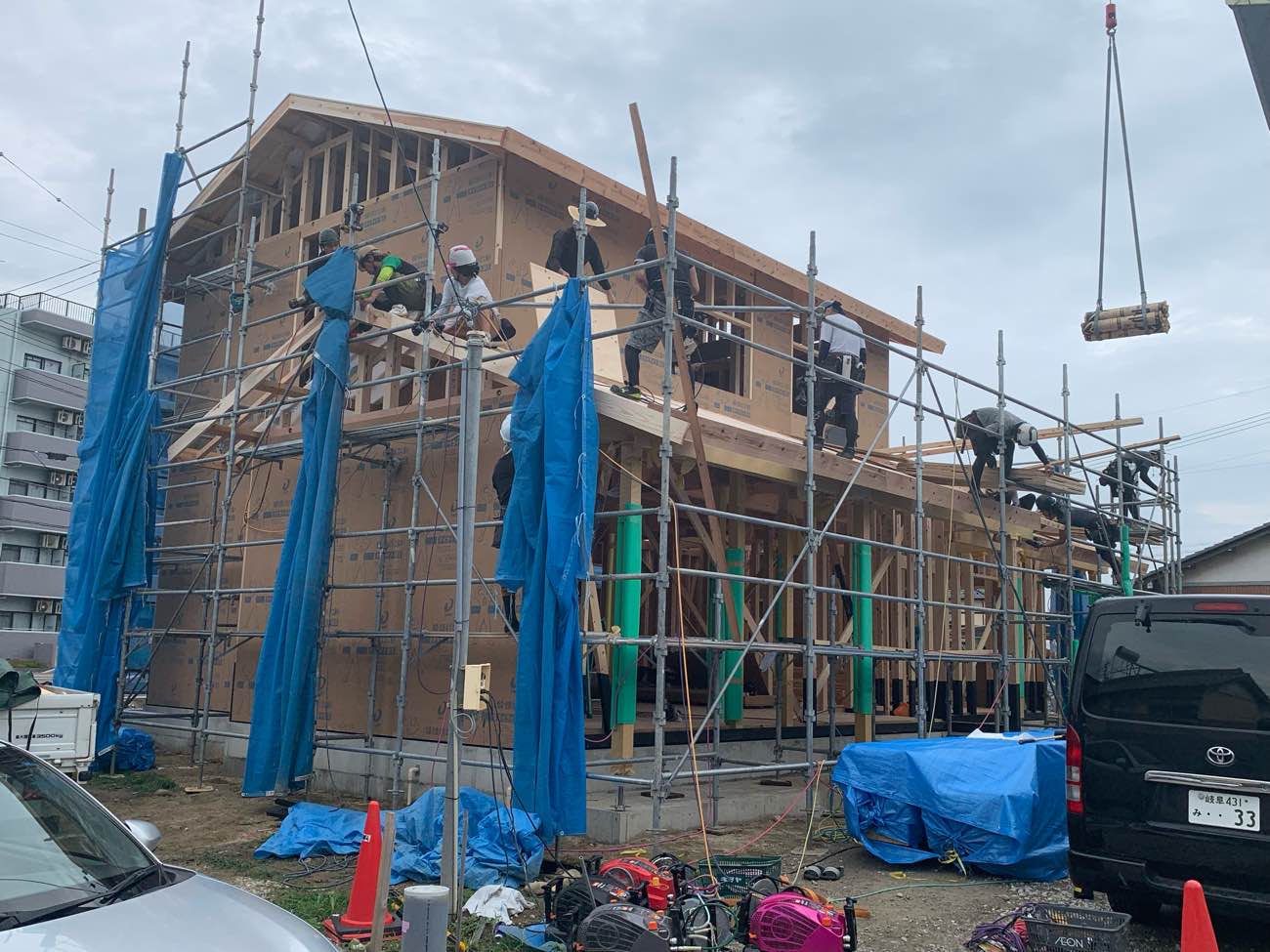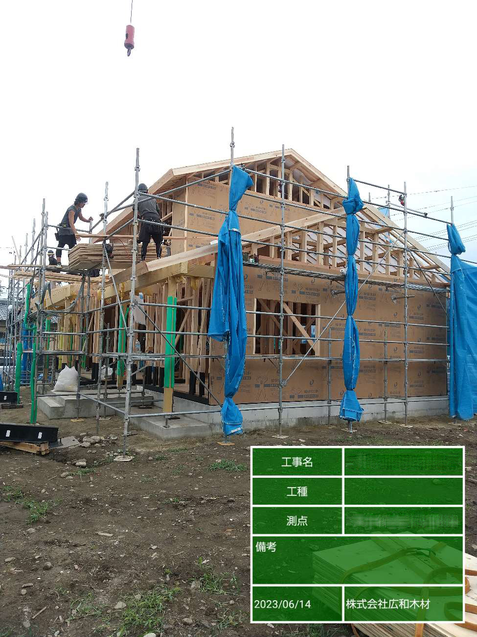 この梅雨時期の上棟は、天気予報とにらめっこしながら、手配を進めます。