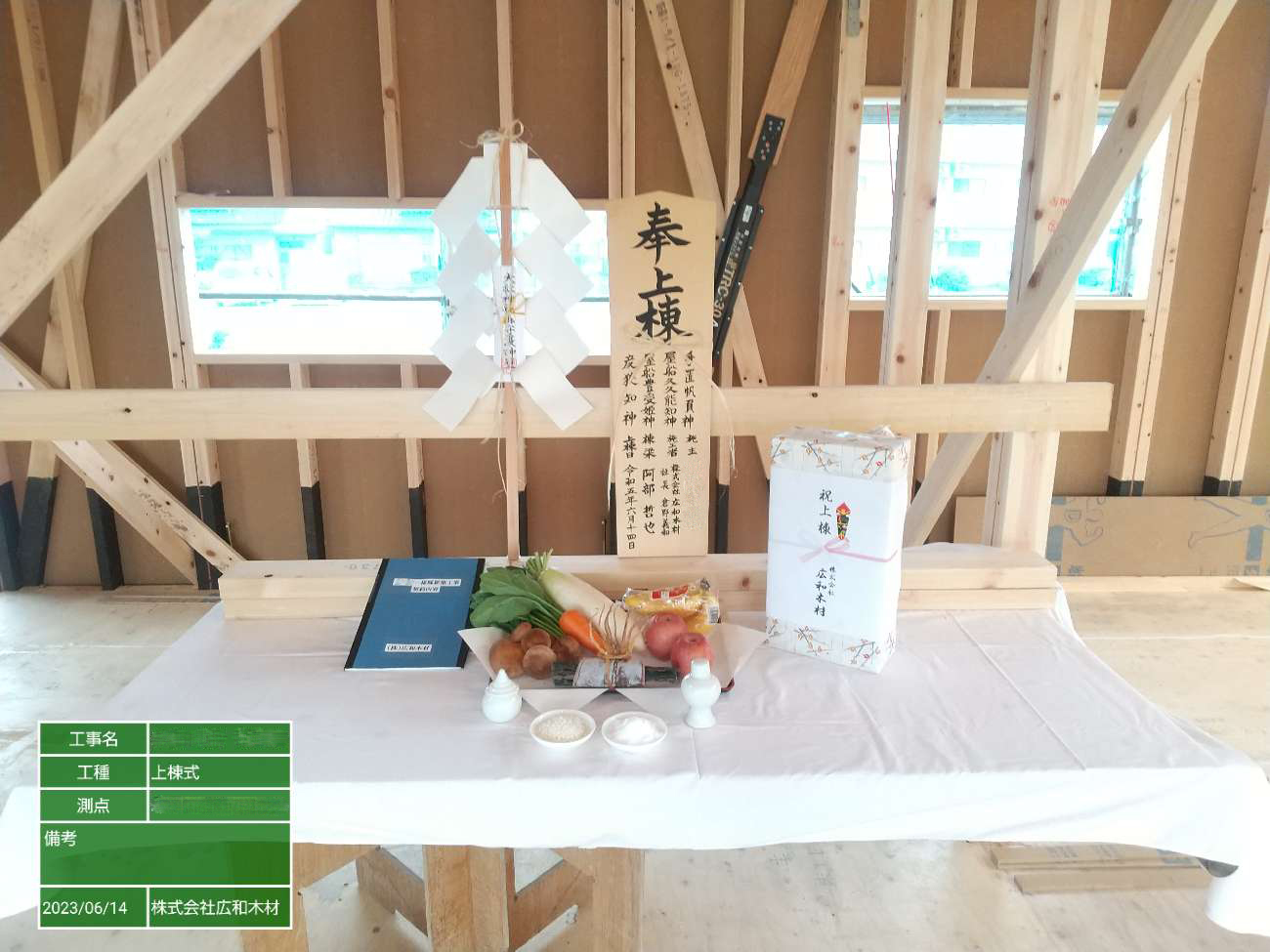 上棟式では、服部棟梁のもと工事の安全祈願と四方のお清めをさせて頂きました。