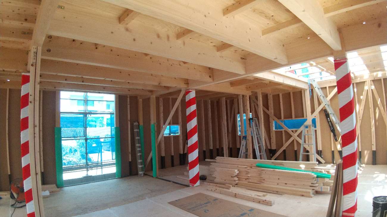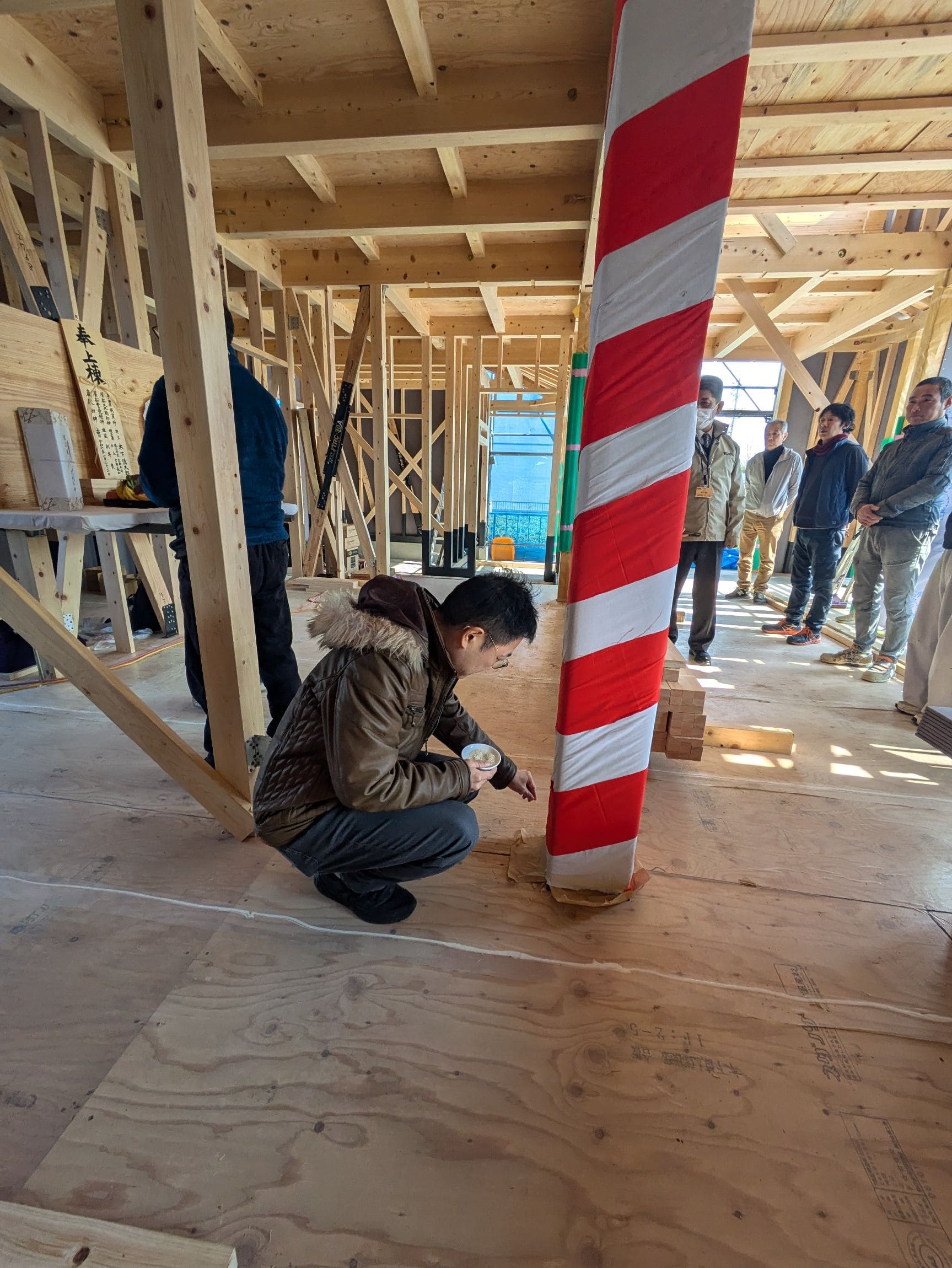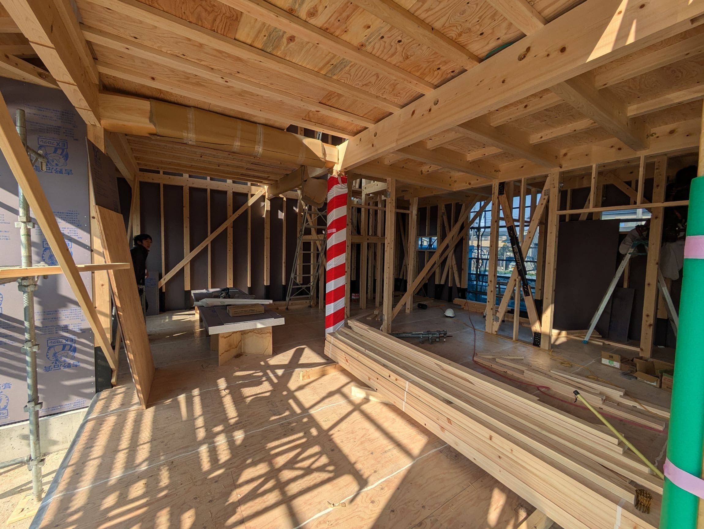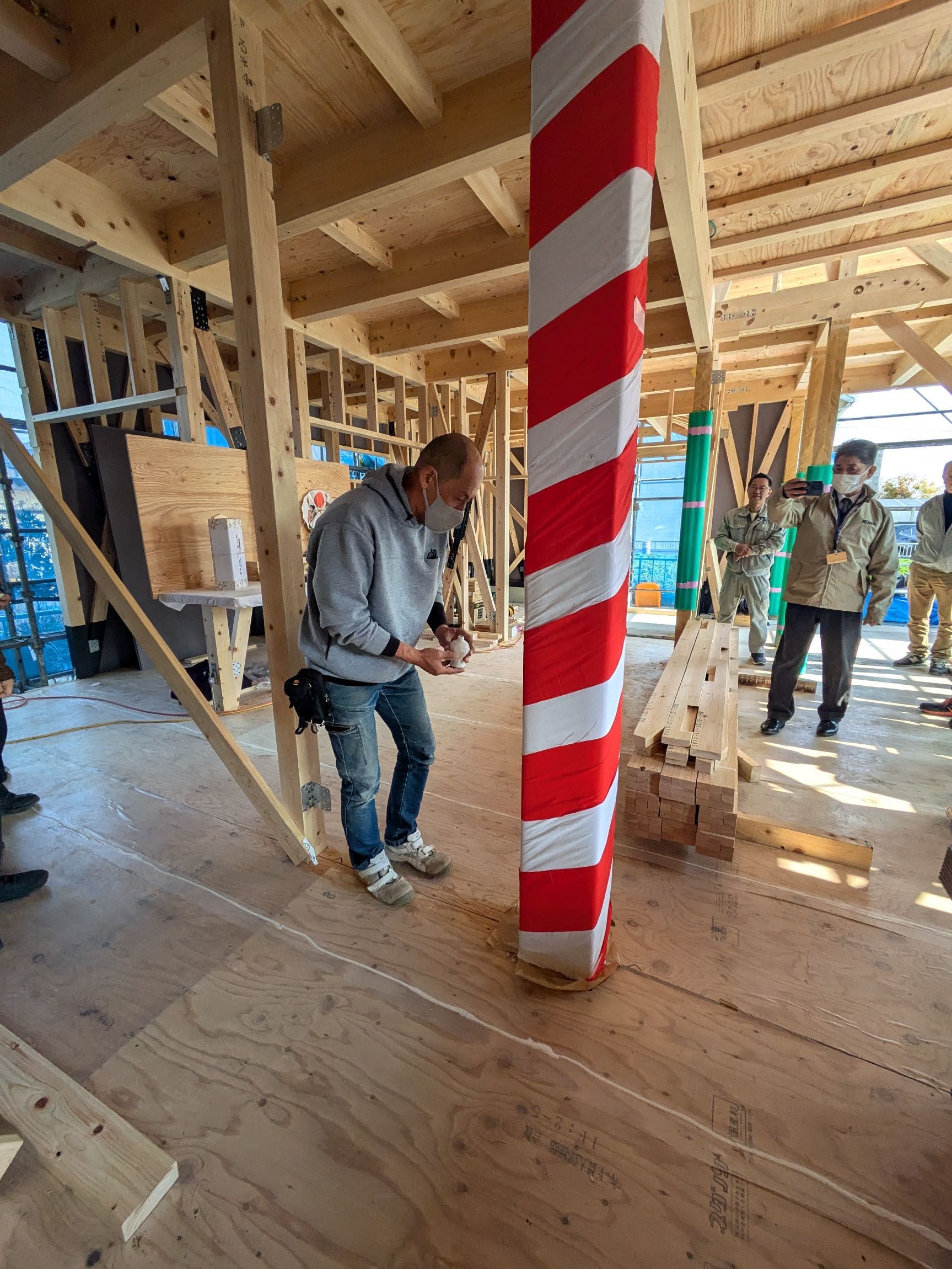 大黒柱等の化粧材は、上棟時には紅白幕で巻かれています。