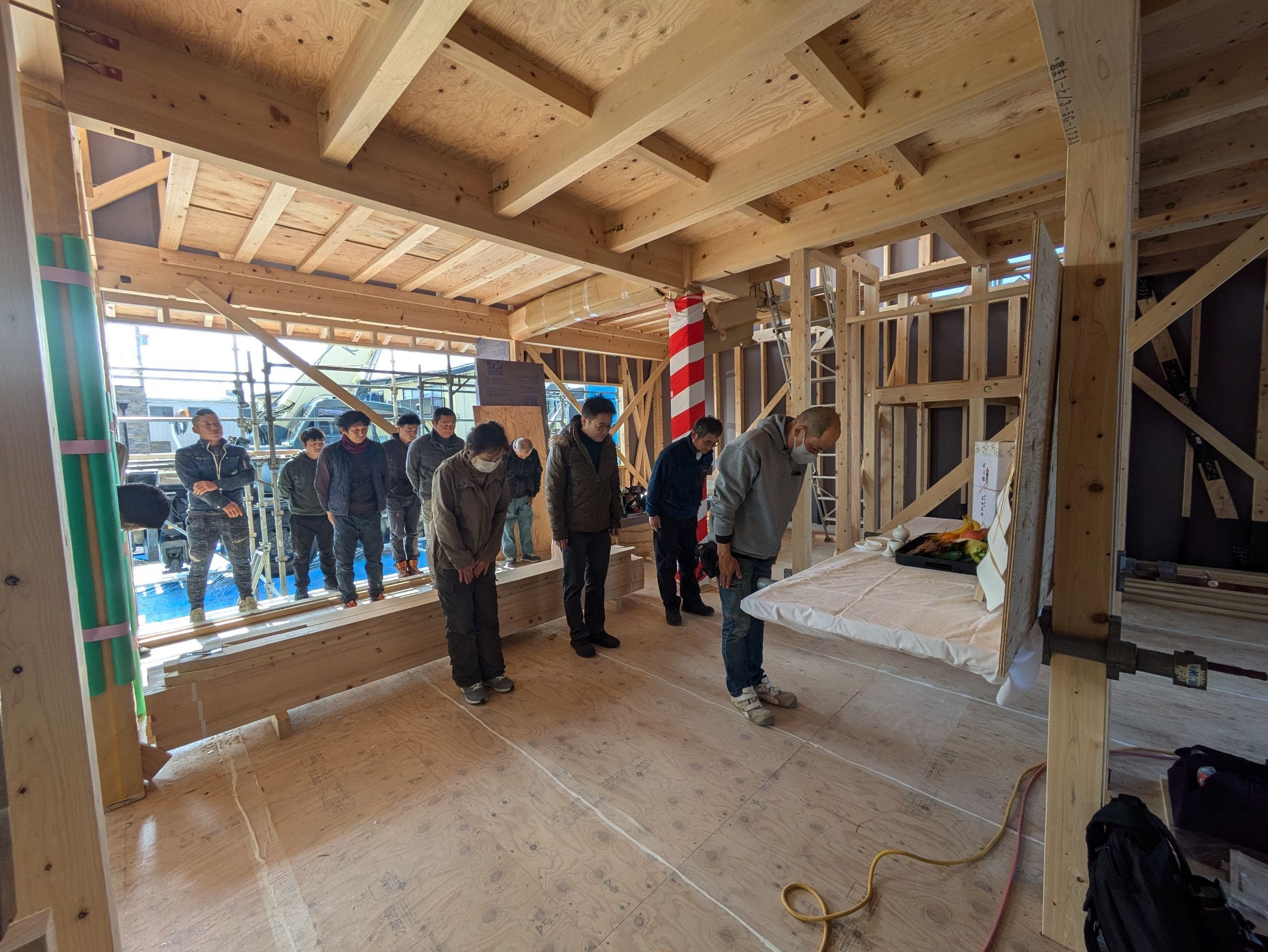 上棟式では棟梁の元、工事の安全祈願と