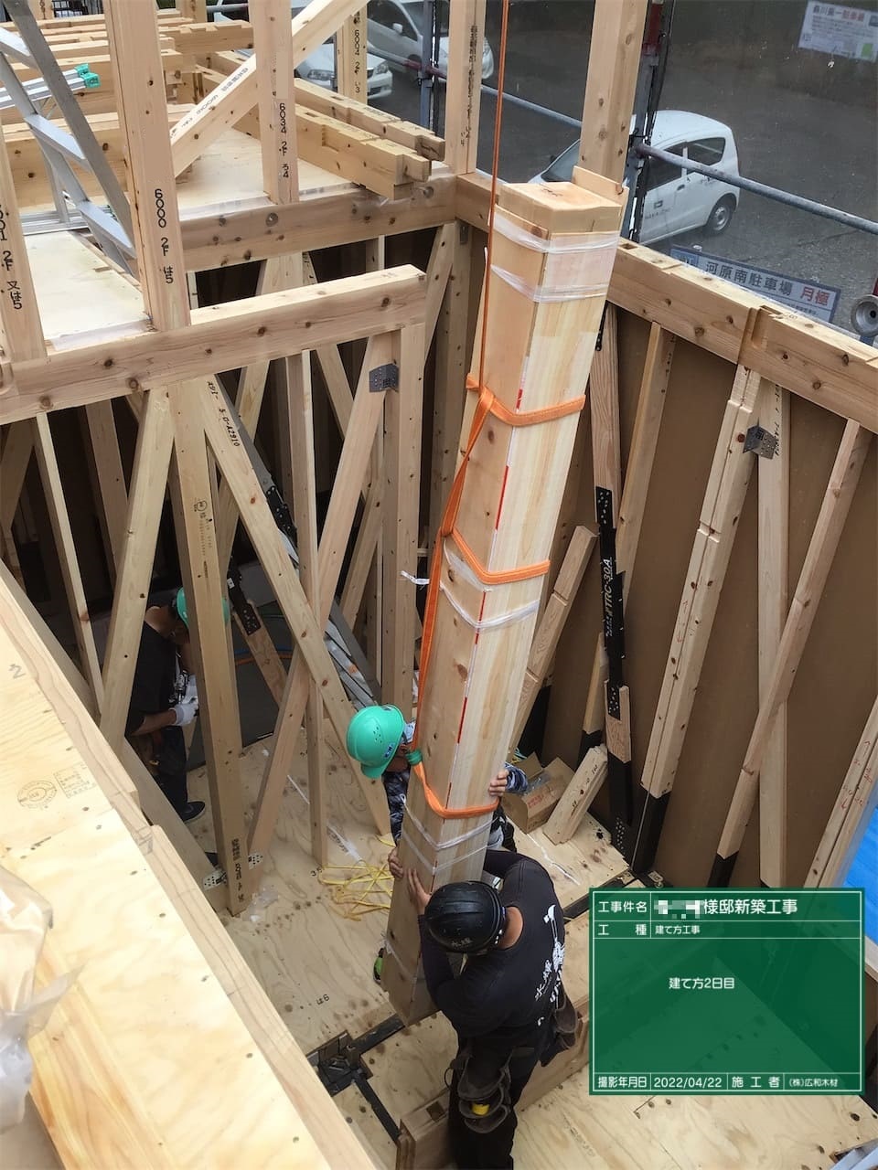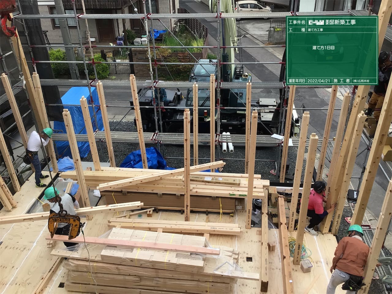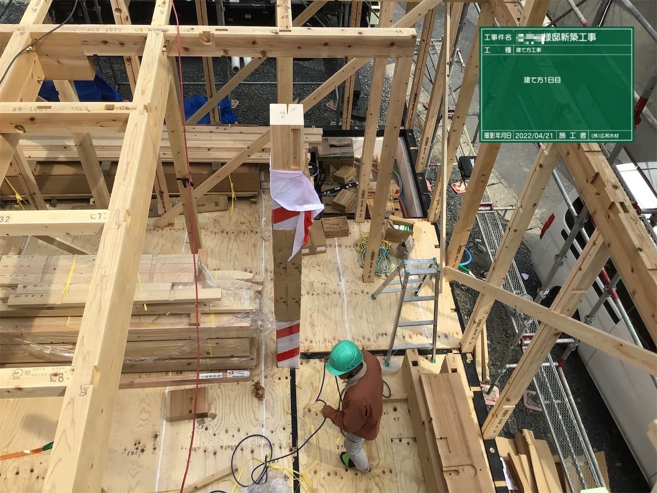 天気予報が毎日変わり、不安でしたが、建方初日は曇りで朝から快調にスタート出来ました。