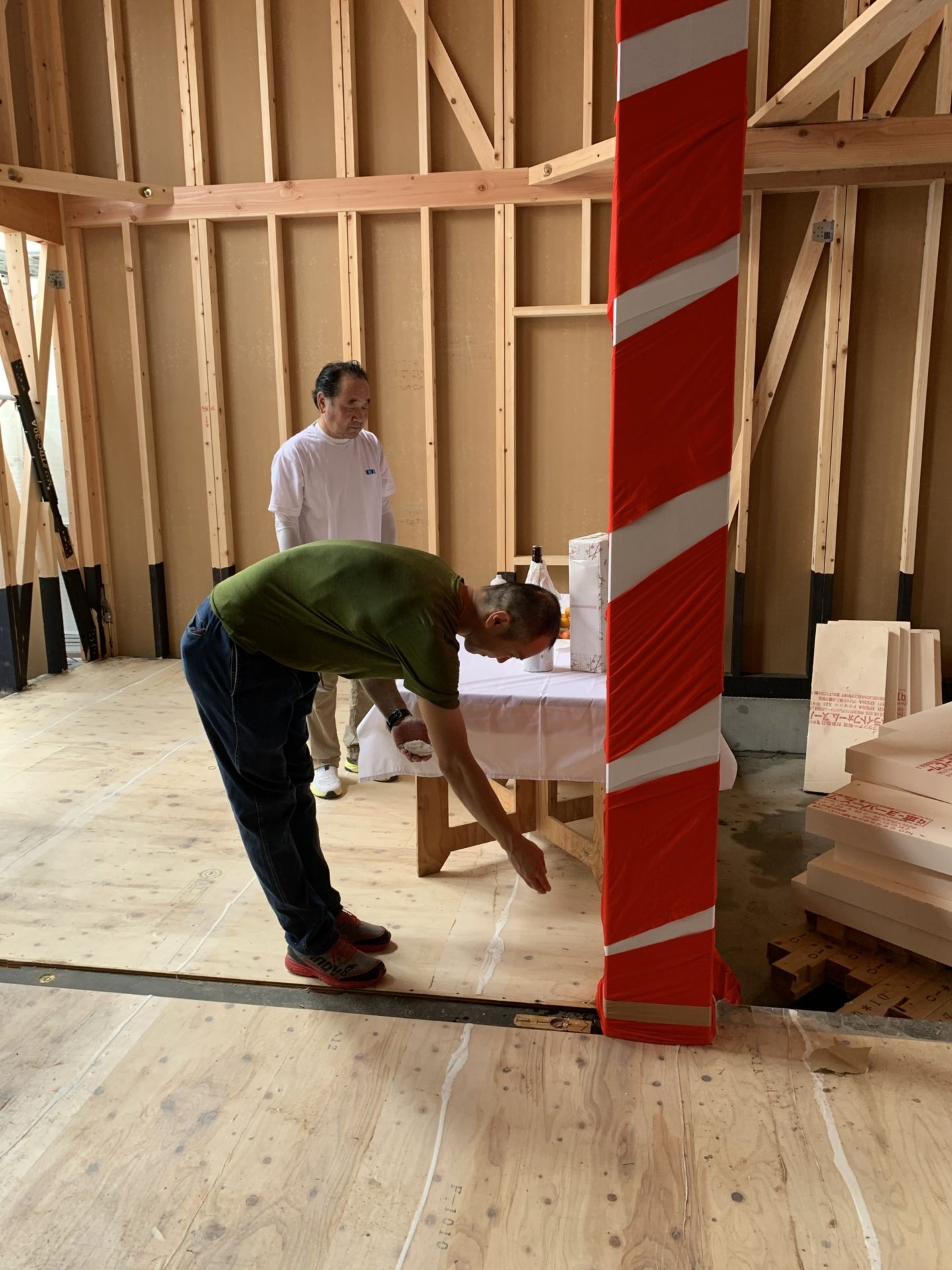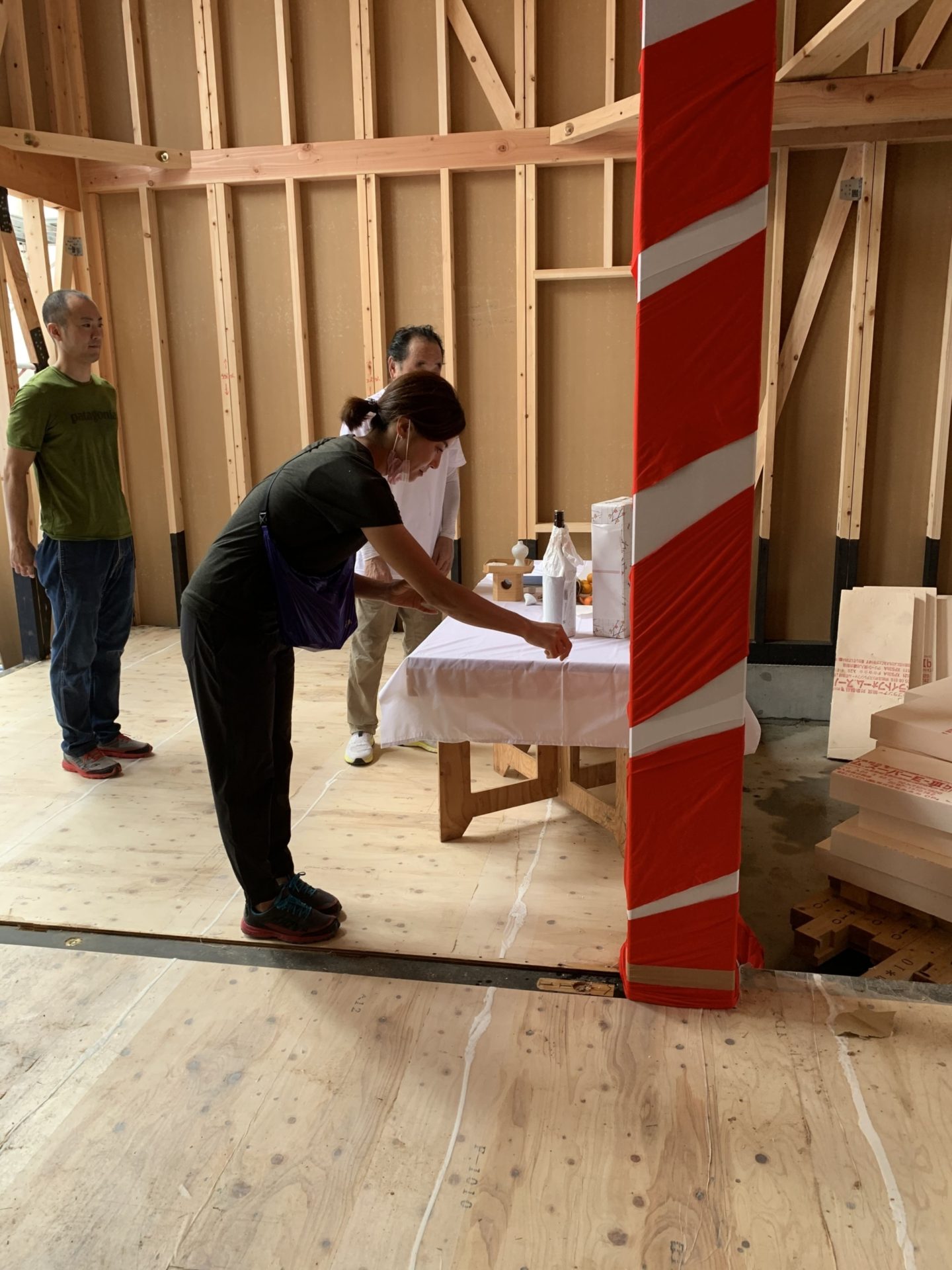 鈴木棟梁のもと、四隅と大黒柱のお清めを行いました!