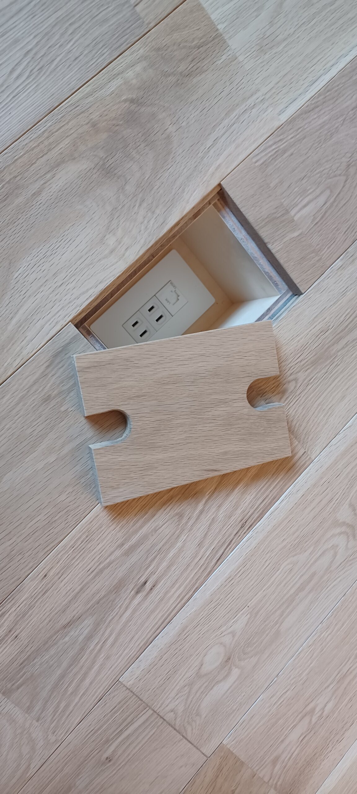 同じフローリングを加工して床コンセントをオーダーメード!