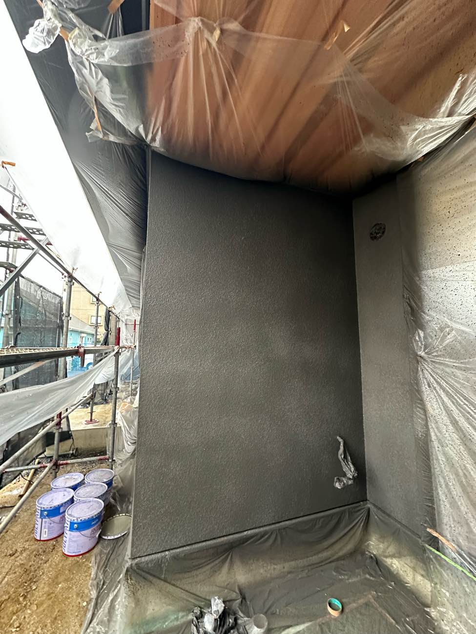 ↑基礎等に薄いシートで養生をしてから吹付塗装します