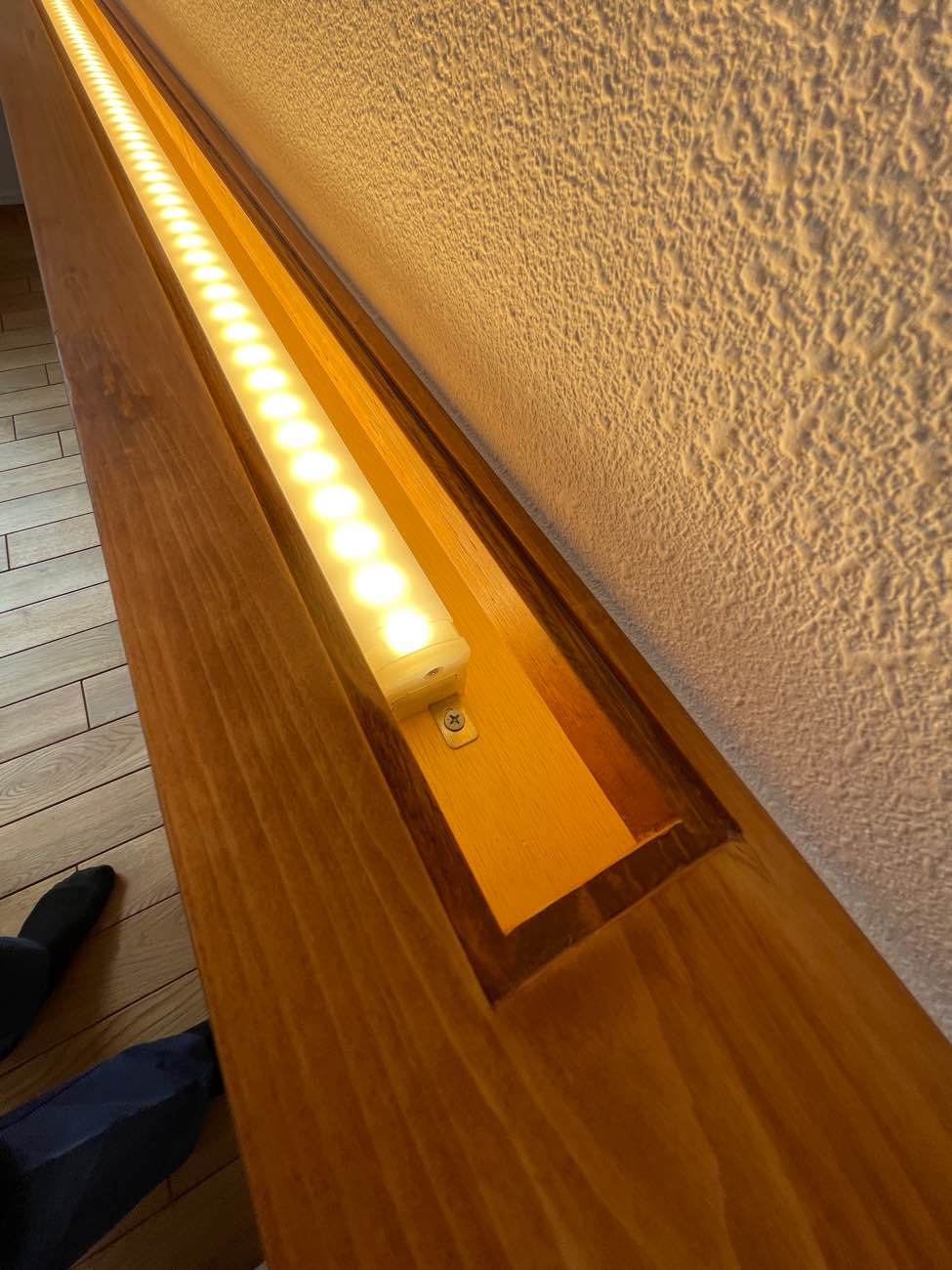 大工さんが壁の上に間接照明を入れるBOXを造作し、壁から電気配線を通しているようです。