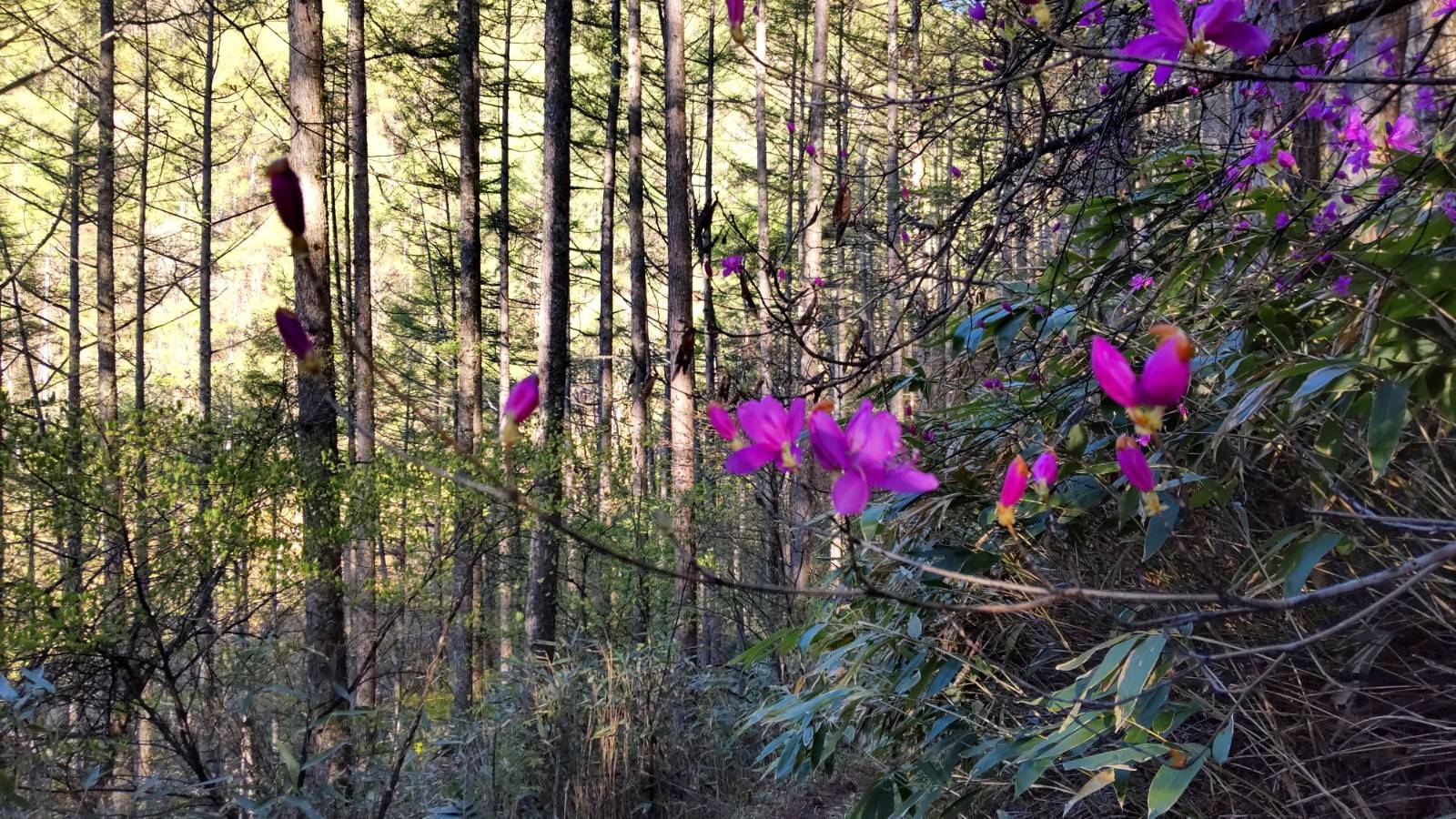 ミツバツツジの咲く登山道をゆっくり登っていきますと