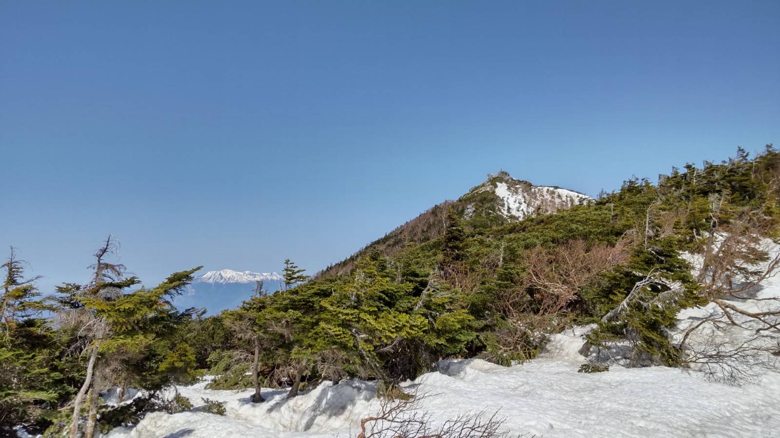 急な登りと3時間程格闘しまして、ようやく稜線に到着。遠くに御嶽山。