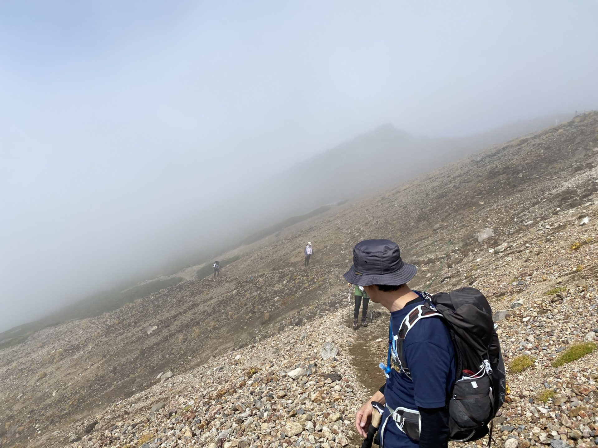 レインウェアを着てテント泊地の山小屋を目指します。