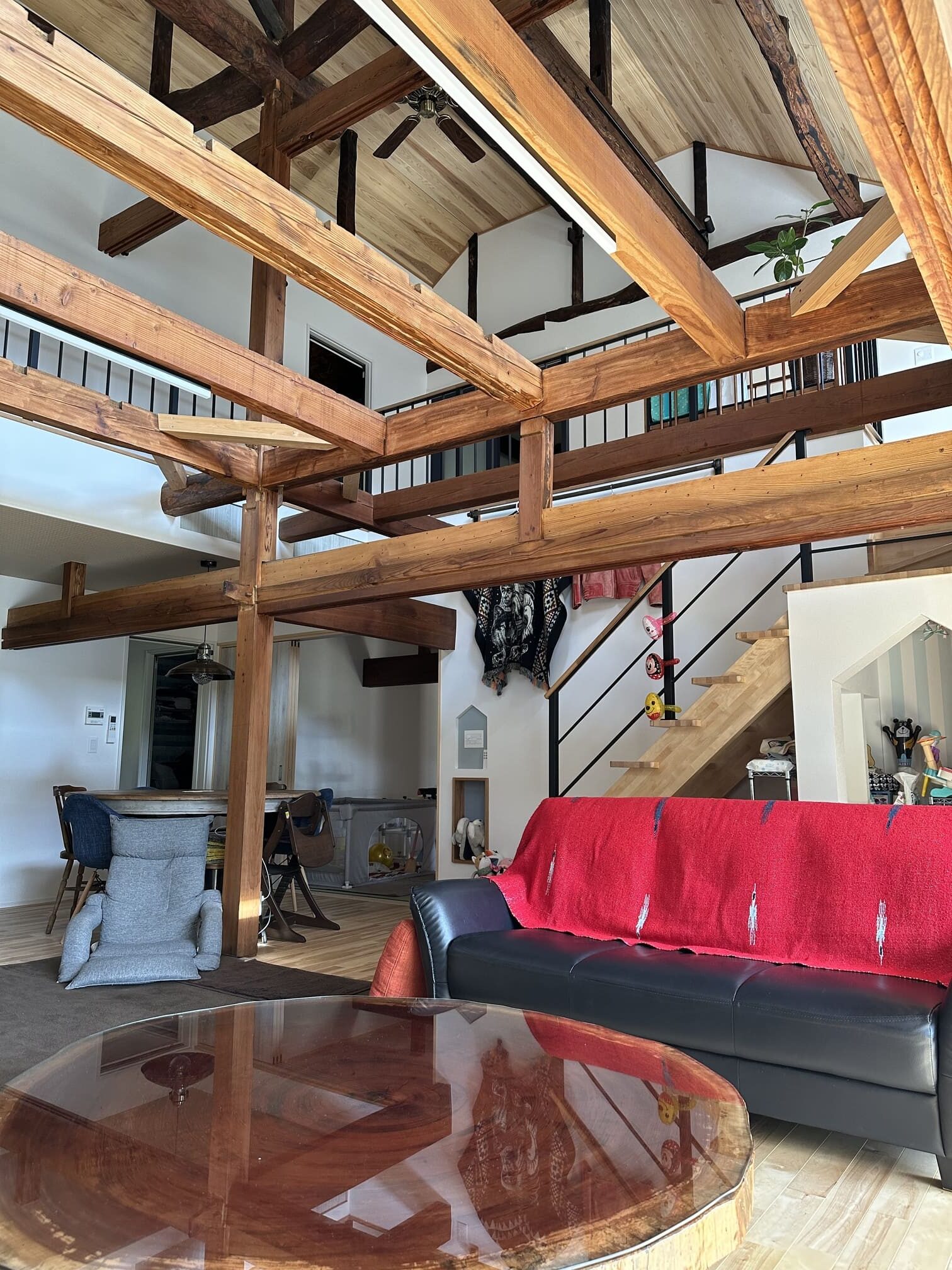 要所ごとに耐震性能や断熱性能を向上させつつ、梁や桁を見せるお家にするためにフルスケルトンリフォームを実施いたしました。