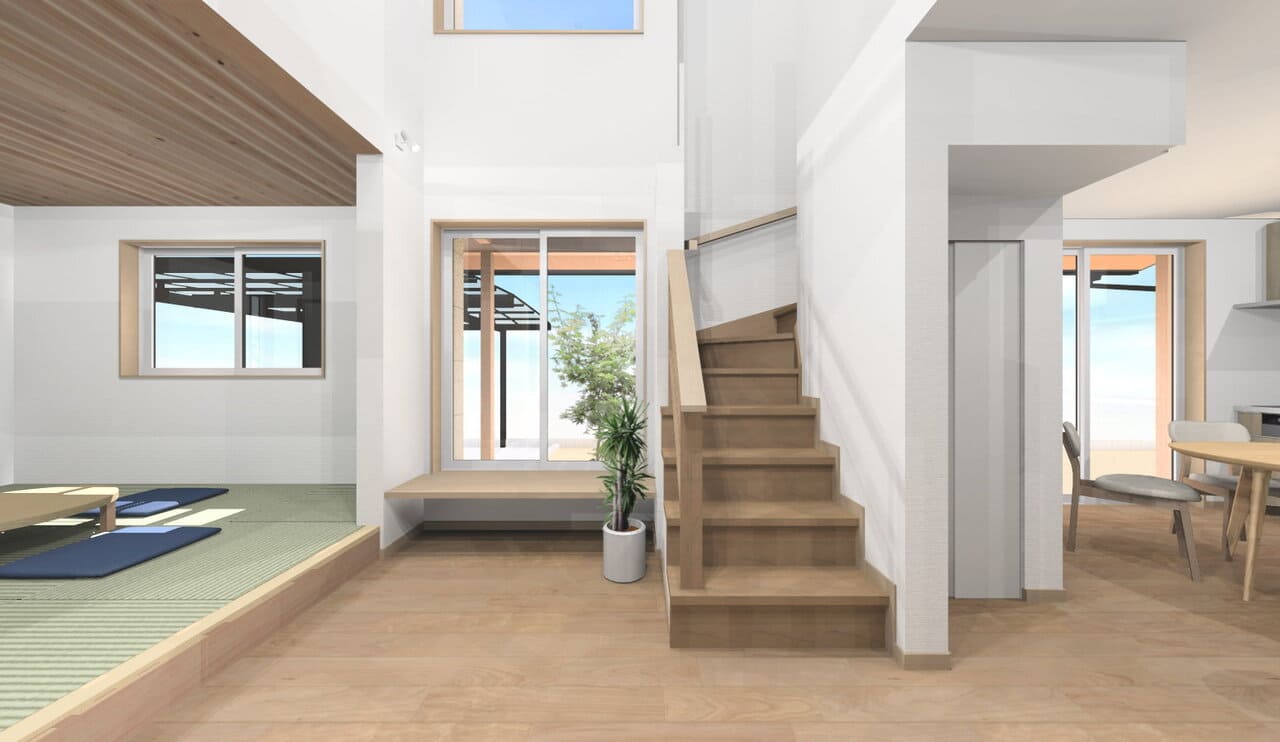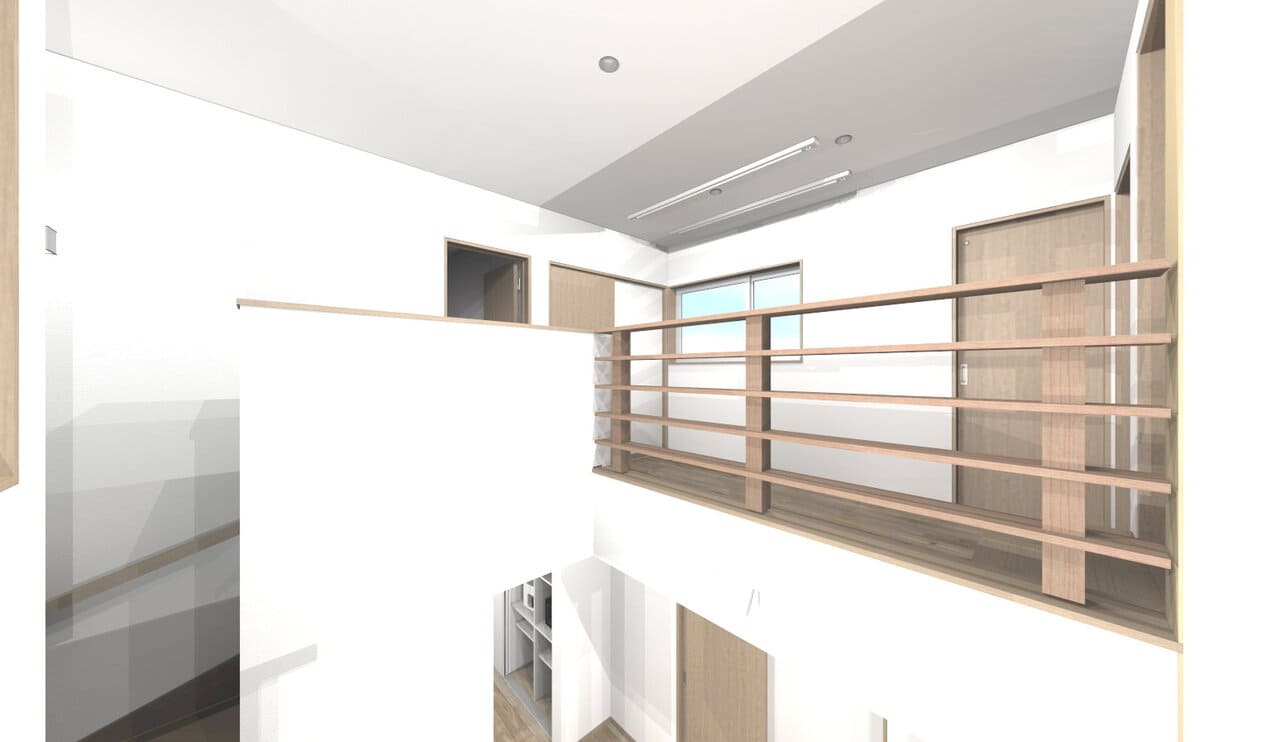 生活動線であり、憩い場やプライベート空間にもなる多目的スペース。吹き抜けにすることで、開放感と明るさもUP。