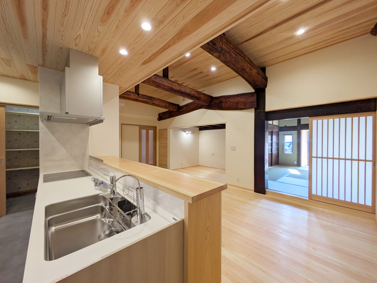 襖によって仕切られていたDK・土間・洋室2部屋をつなぎ、家族全員がゆったりと寛げるLDK空間へ。